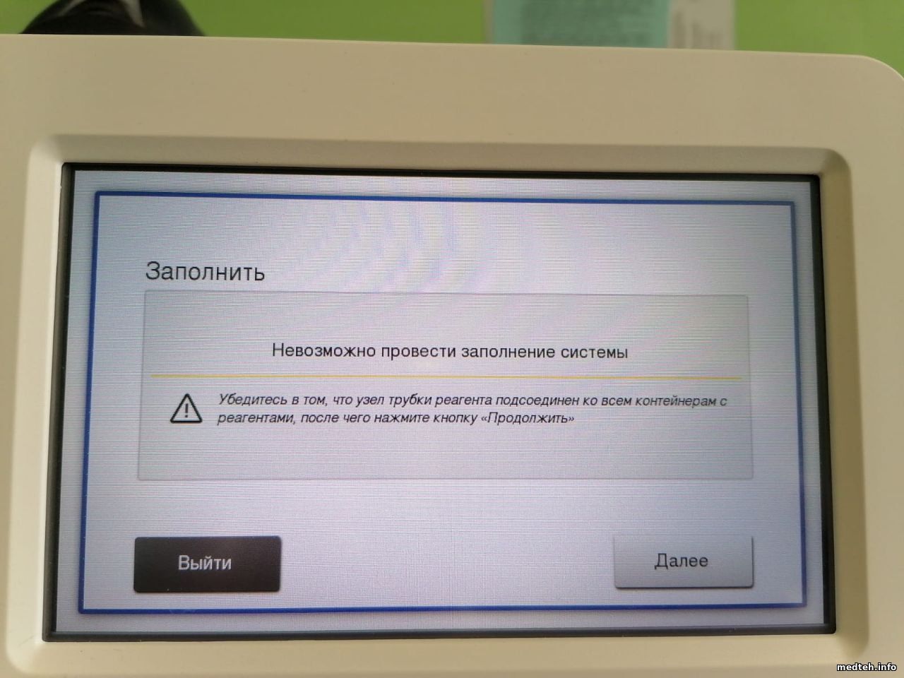 Анализатор Medonic М32 вначале выдавал флаг TL, начали делать промывку, слили лиз и дюлент, залили гипохлорид, замочили, слили гипохлорид, начали заполнять, начал выдавать ошибку невозможно провести заполнение системы.
