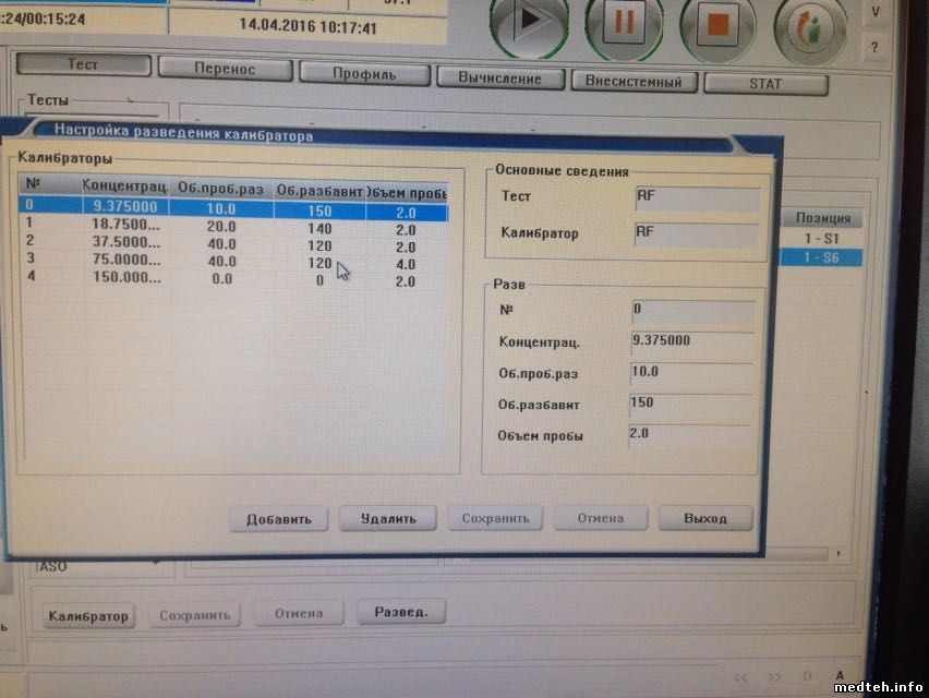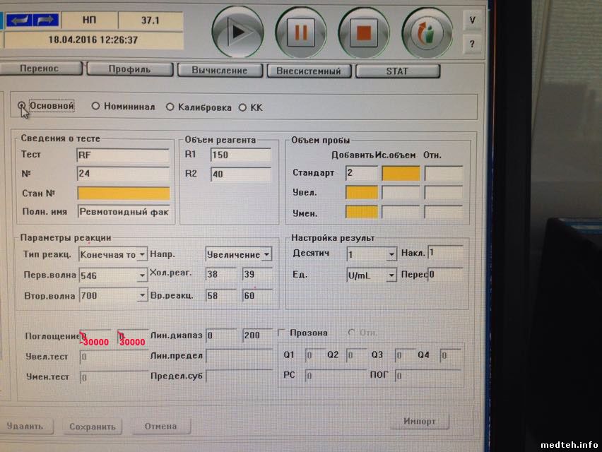 Добрый день. Просят дистанционно помочь, сам мало на BS-380 работал. Проблема такая: поставили ревматоидный фактор, откалибровали по 2 точкам, контроли не прошли (что естественно). Я порекомендовал многоточечную калибровку, но калибровка не принимается (ошибка "невозможно рассчитать этим способом"). И ещё идёт ошибка "вне зоны поглощения". Пробовали: разные типы правил калибровки (многоточечная, logit4p, logit5p, spline); ручное/автоматическое последовательное разведение калибратора (калибратор один в максимальной концентрации); Чтобы ошибку "вне зоны поглощения" убрать, порекомендовал в графе "поглощение" вместо 0-0 (что, по инструкции, означает отсутствие проверки) поставить -30000 и 30000. Тоже не помогло. Ещё пробовали вместо конечной точки фиксированное время ставить, тоже не помогло.