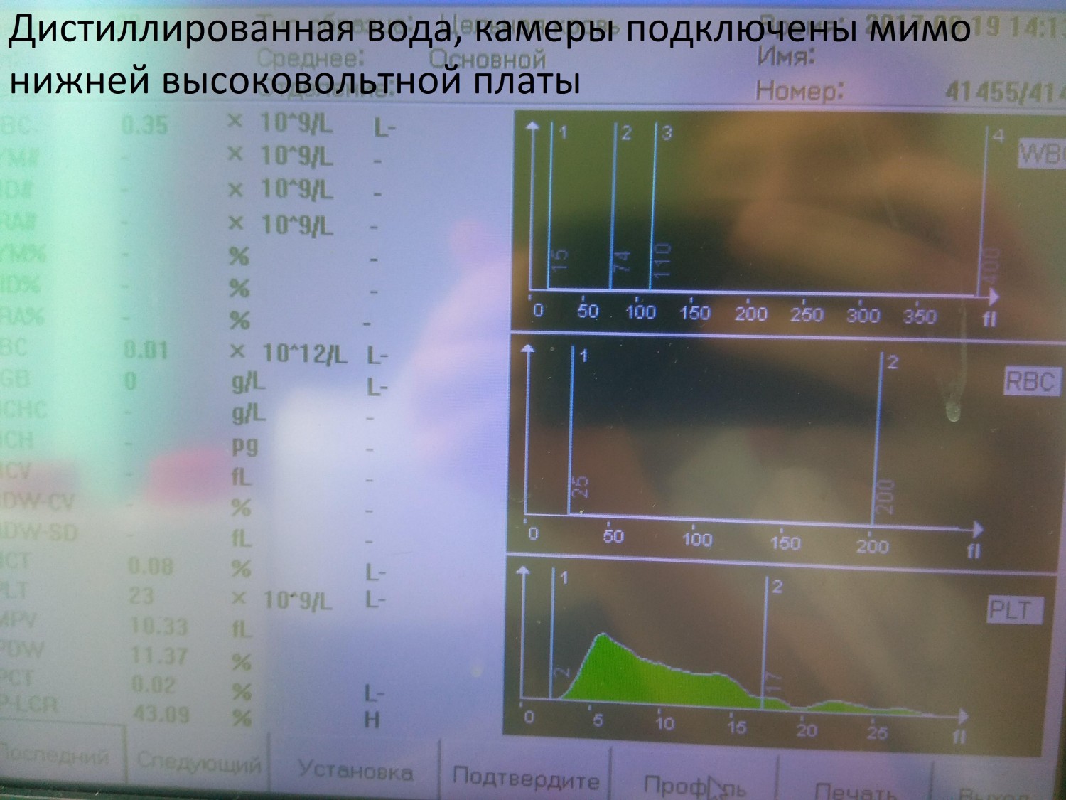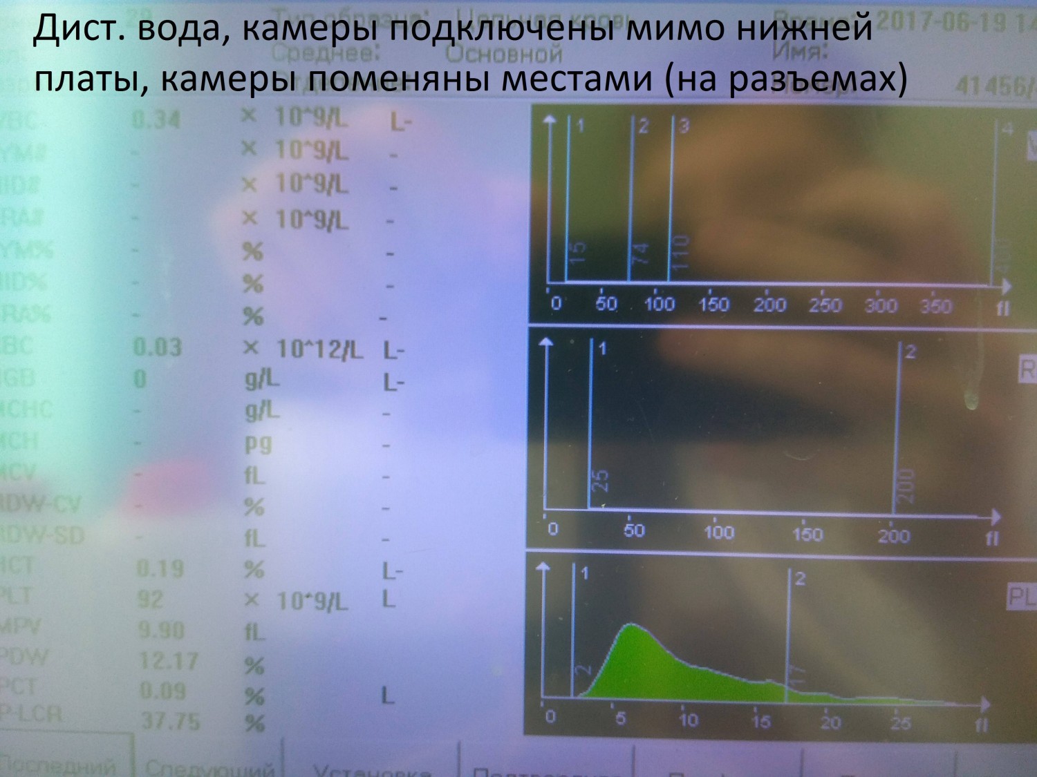 Добрый день/вечер, соратники! Аппарат пришел с проженной камерой WBC, камеру заменили, апертура цела. Проблема первая: дикий фон по лейкоцитам, тромбоциты не считает, сильный пик по гистограммам (фото прилагаю). Предусилителю хана? или лечится? Можно ли поменять местами WBC и RBC камеры на разьемах в этом аппарате? Проблема вторая: трубку от восьмого клапана к дилюратору под давлением срывает (в момент наполнения камер из пробозаборника). По субьективным ощущениям, давление действительно большевато (из пробозаборника довольно мощная струя). Примененные меры: аппарат промыт белизной во все трубки, перебраны все клапаны (затем проверены), проверена вся жикостная схема на предмет "перепутал трубку", чистка дилюратора и вакуумника, резинки размяты, отпарены, чистка пробозаборника, промывочной камеры. Куда скакать? П.С. пароля от сервиса нет, 7600 не канает