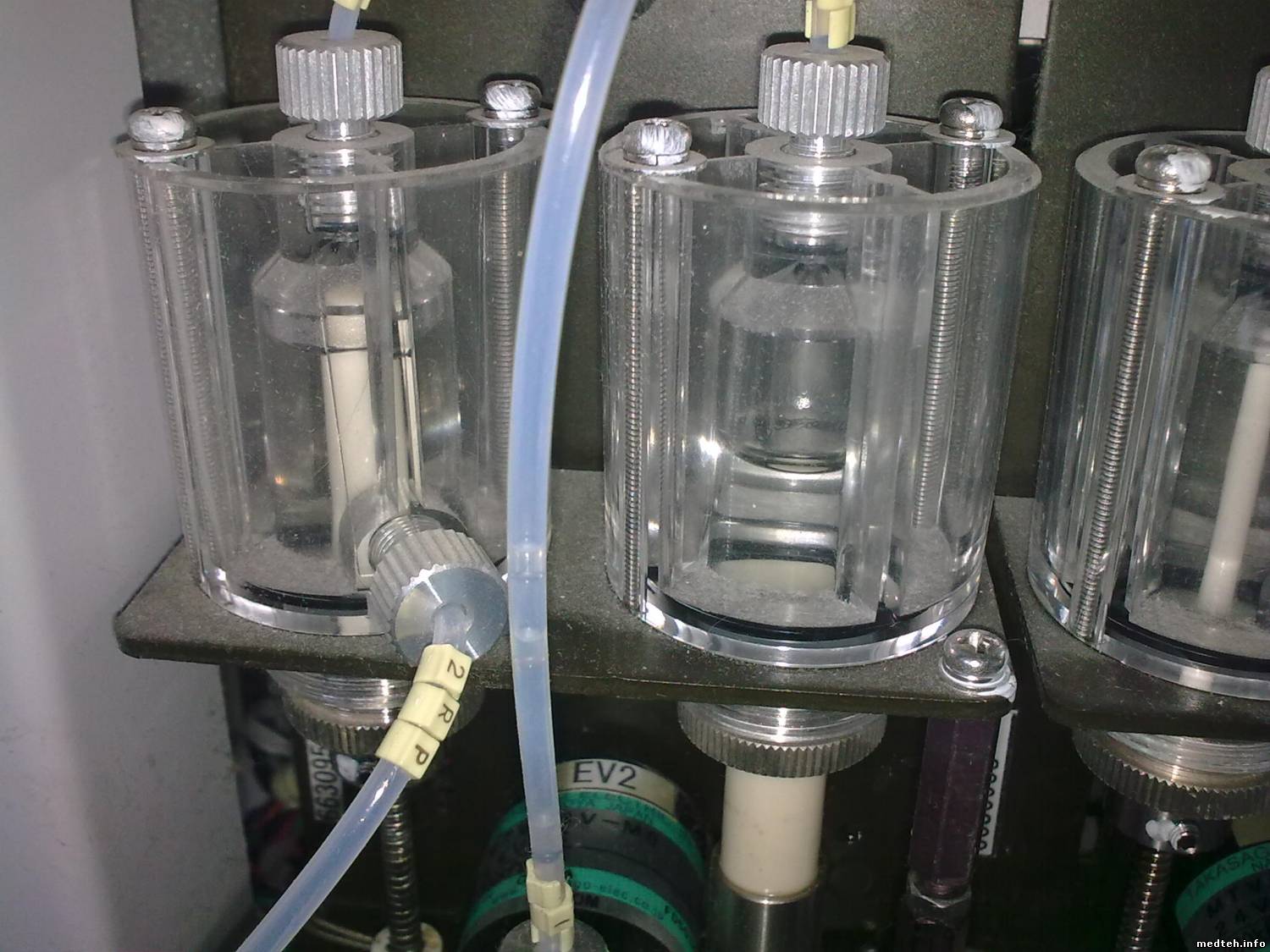 Из фото видно что в гидравлической системе очень много водорослей (http://www.medteh.info/_fr/7/5685599.jpg). Поэтому для начала необходимо промыть всю систему гипохлоритом (все трубки, кроме сливной, опустить в банку с гипохлоритом и сделать пару раз заполнение системы) потом отмыть его раз 5-10 заполнить систему дистиллированной водой, ну а потом подключать реагенты. Я мыл дегазер слабым раствором соляной кислоты, так как со временем там образовалась "накипь". После этого 100% заработает!