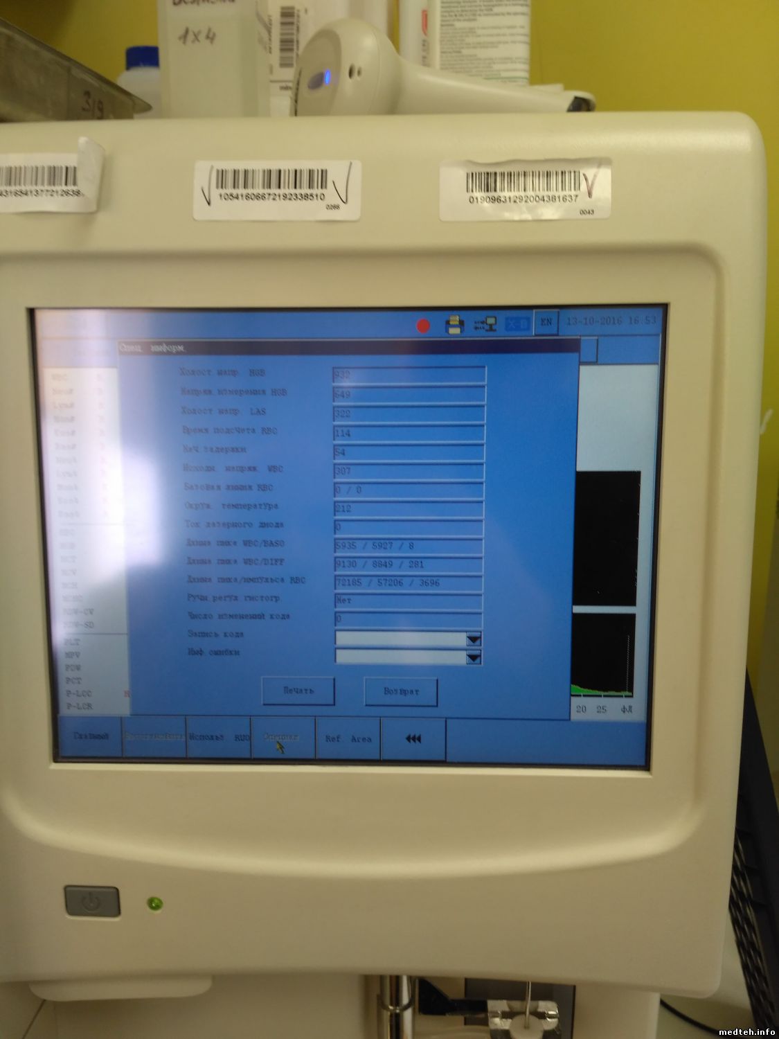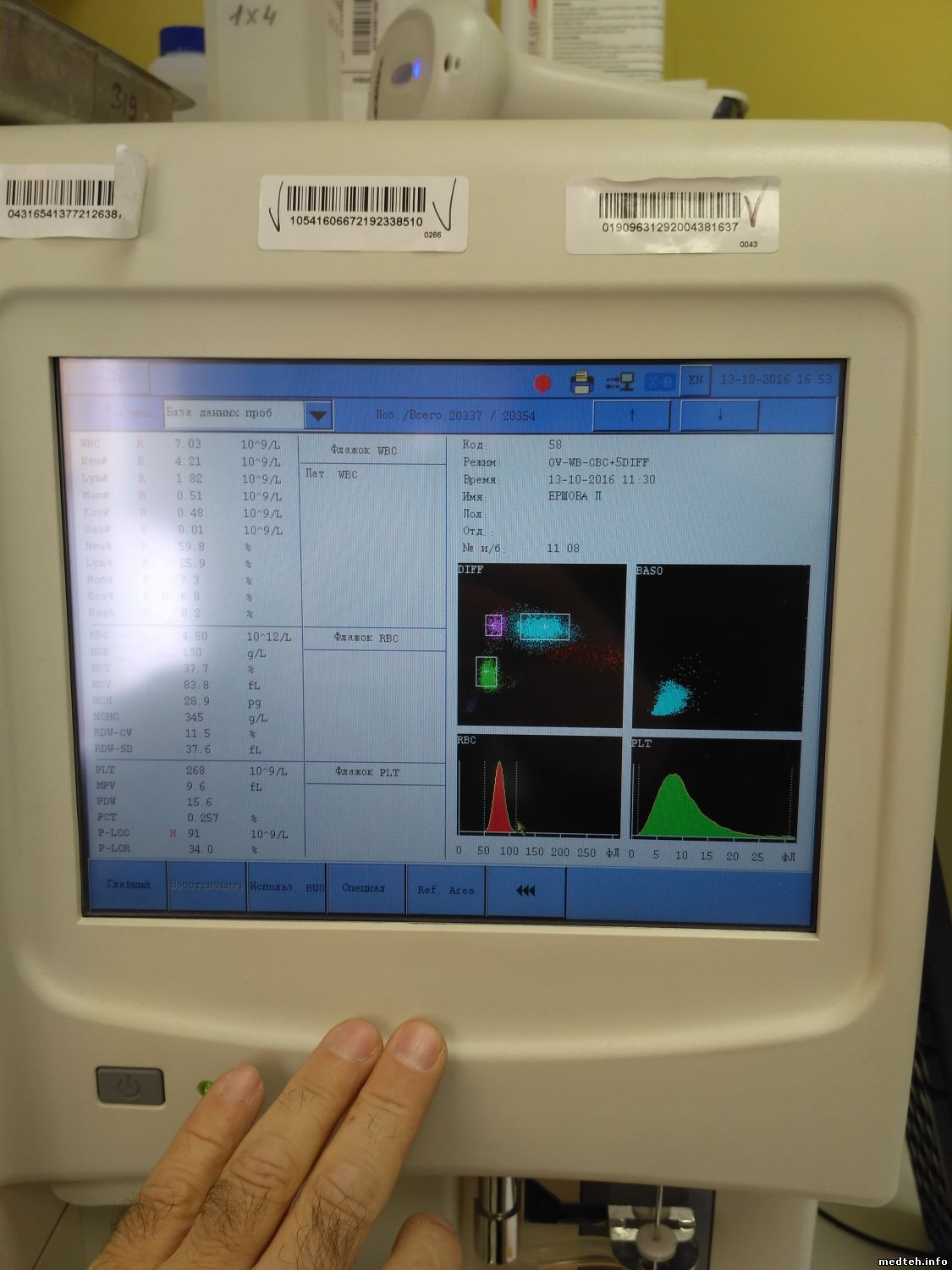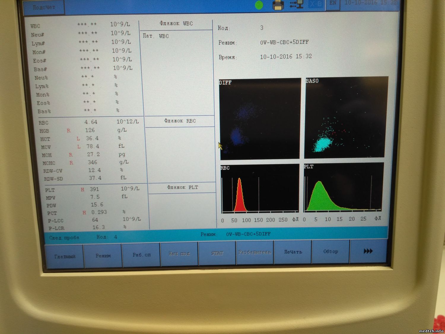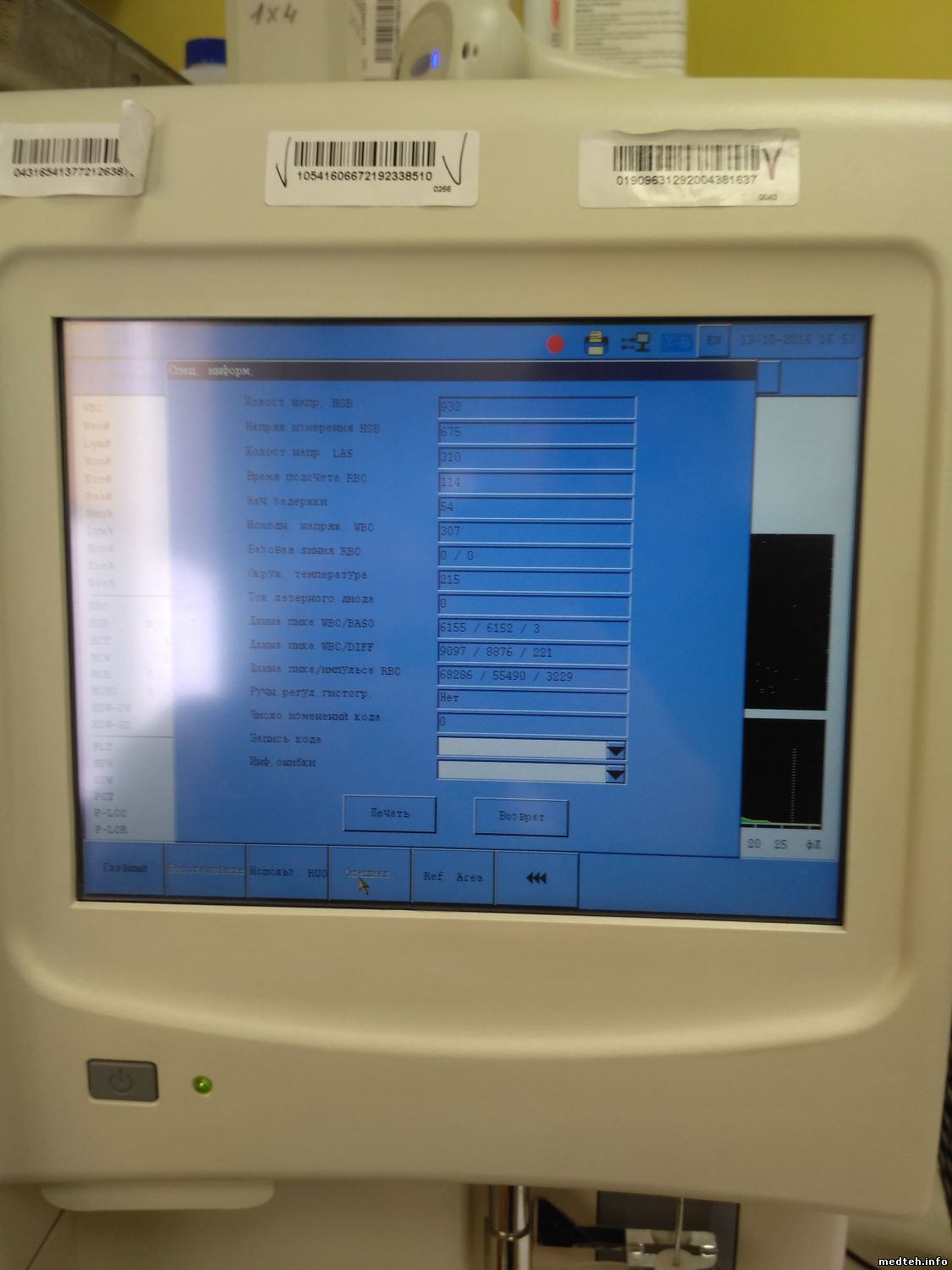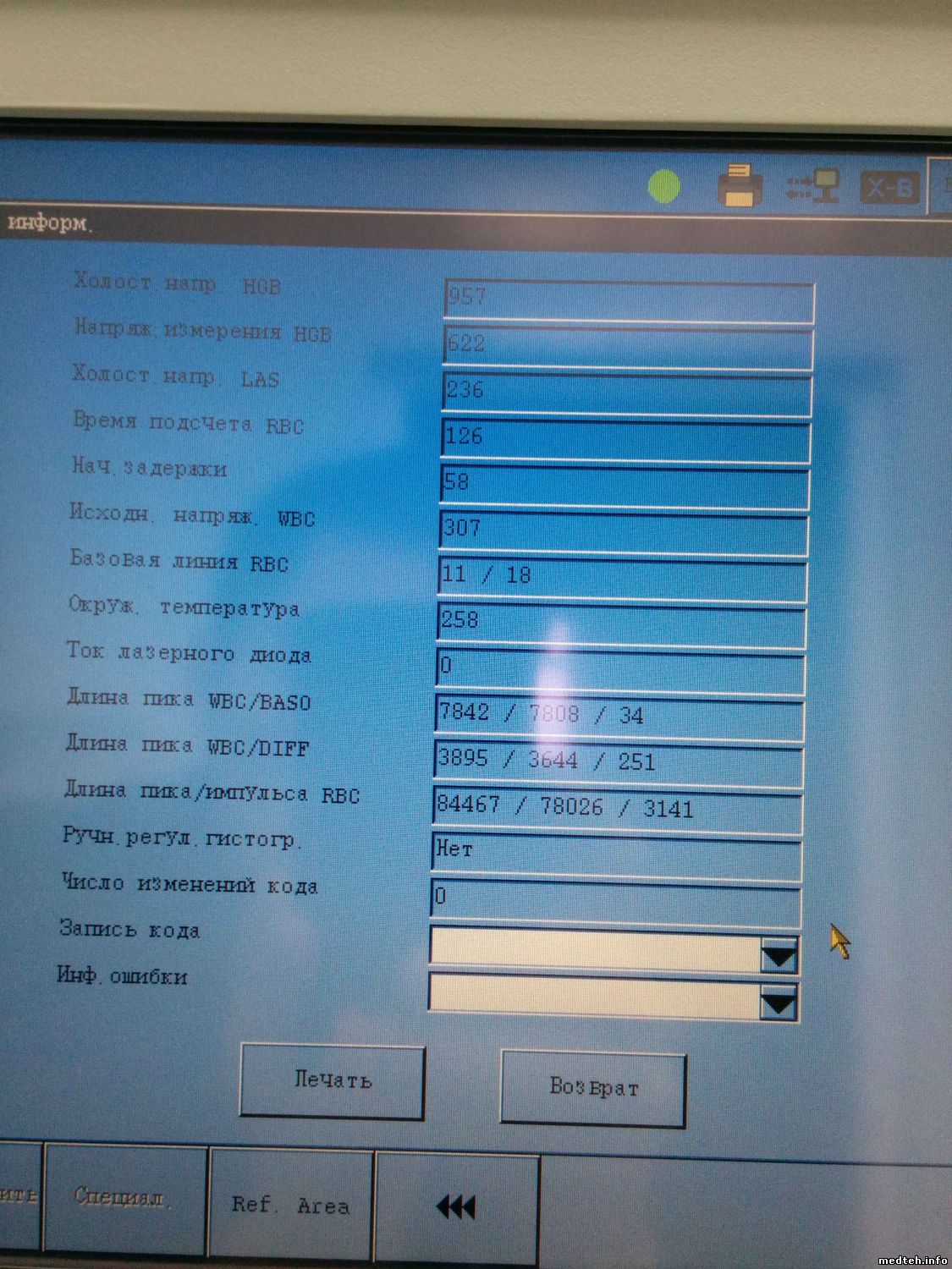 Под сервисом, нажать на стрелки >>>. Нажать кнопку "Специал.". Только, судя по фото, которые выкладывал jonn84, может быть разница значительная(больше чем 15%), но все равно результат выдает. doctor_farsh ну да, с baso явная беда, похоже образец даже не подается в ячейку. Посмотрите выход с камеры baso, металлический штуцер может быть забит, только аккуратно с ним хрупкая вещь... Если правильно теорию помню LBA сжимает все лейкоциты, кроме baso. Было бы больше клеток на скатерограмме, а у Вас, как будто один дилюент в ячейке, мне кажется, либо не подается в камеру baso кровь, либо от baso не идет в ячейку.
