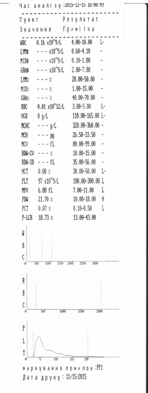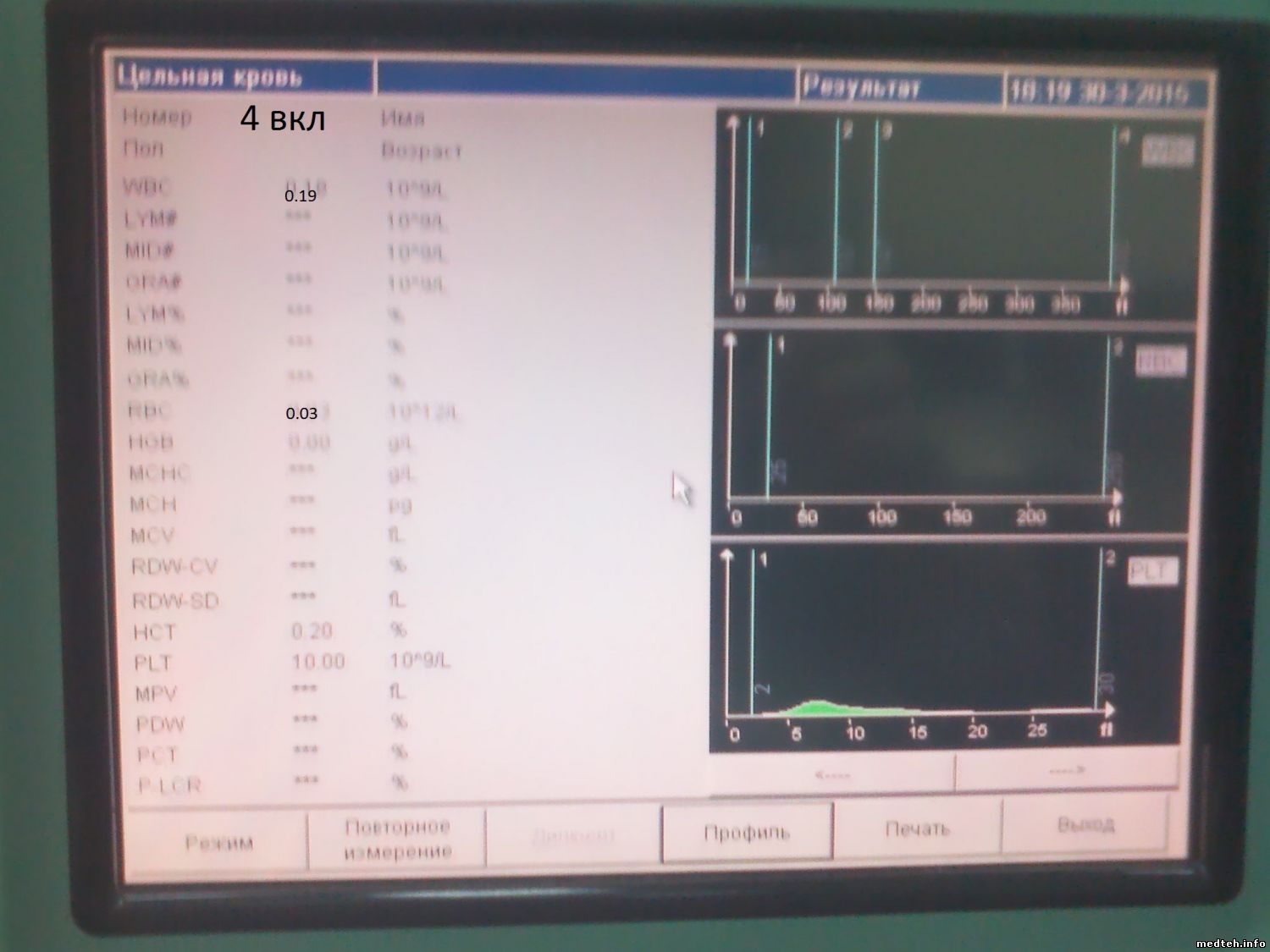 Пример: Тромбоциты больного, измеренные на МЕК-6410, Sysmex KX-21n - до 10 единиц, анализатор RT-7600 выдает приблизительно 75-85 единиц. Фоновое измерение по тромбоцитах - 0 ед! Контроль качества по Para 12 Extend N - все отлично!