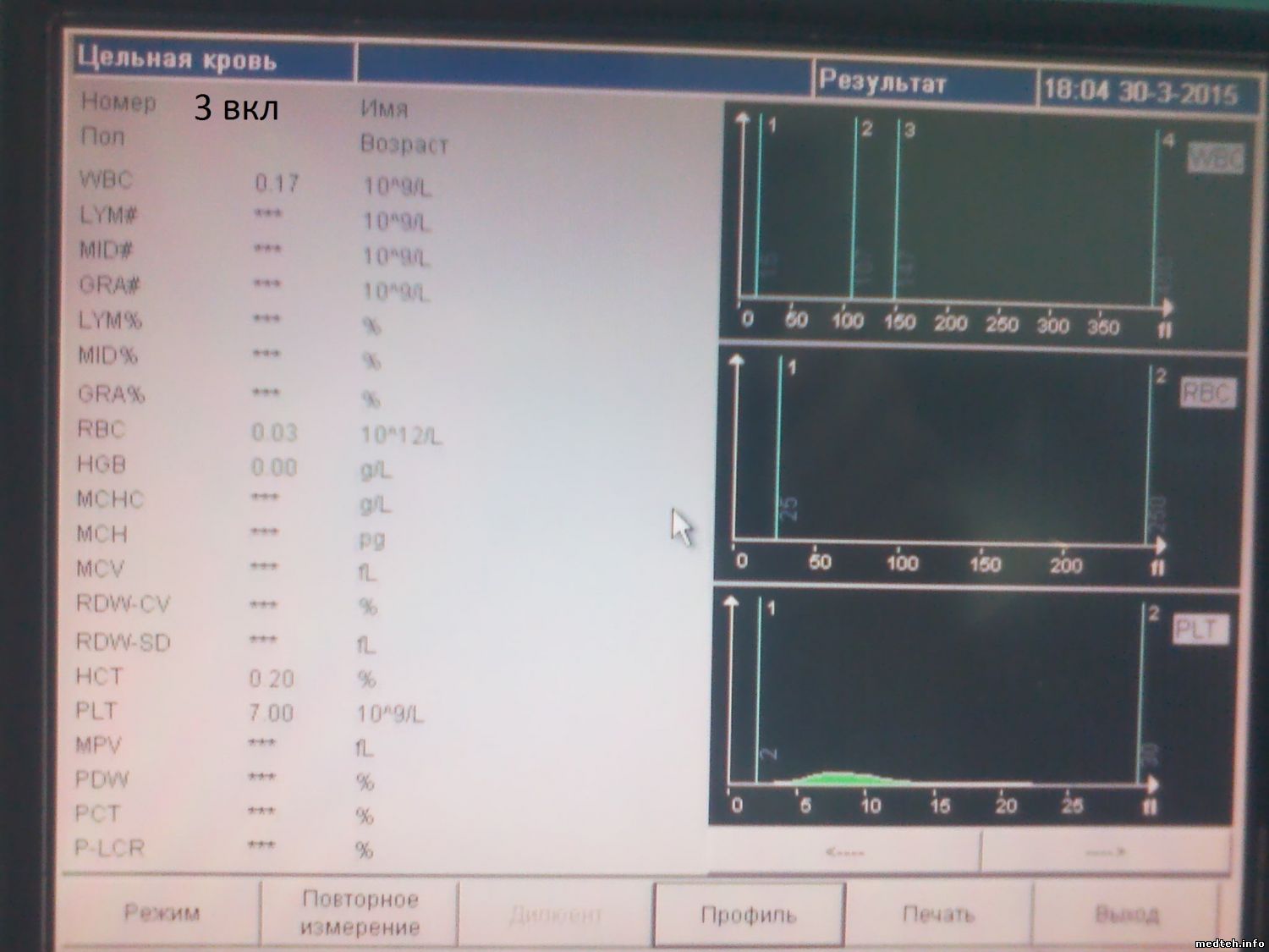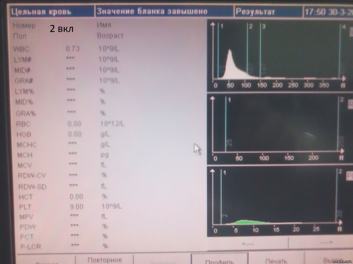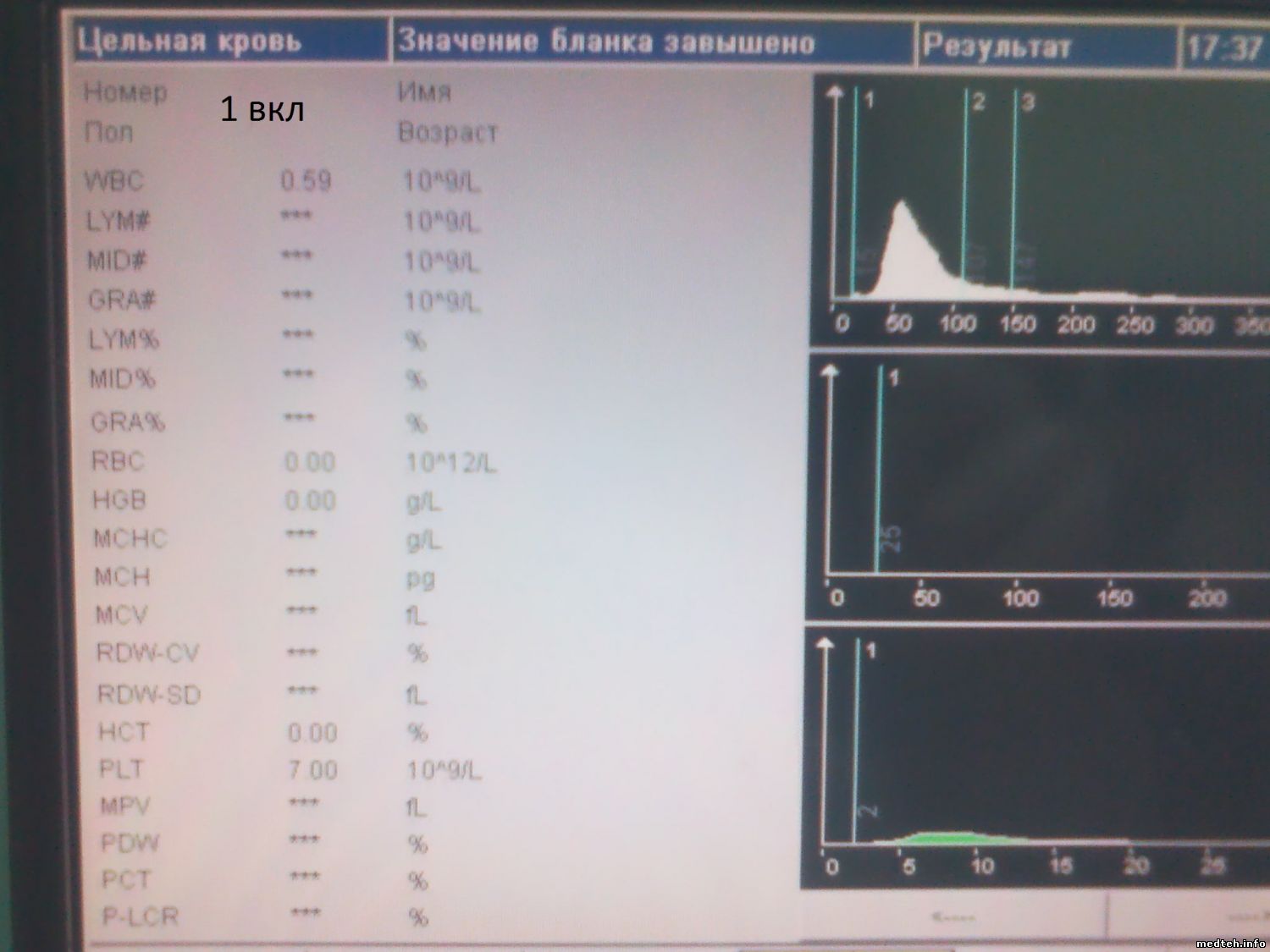 Что только не делал!!! А оказалось банальное- подключаешь прибор через примитивный сетевой фильтр с шестью розетками, и проблема фонового PLT уходит. Да, советовали такое, но не верилось, т.к. в этом сетевом фильтре лишь RC цепочка. НО! новый прикол, на бланке всегда все стабильно, по нулям, на тесте крови скачет WBC (то 4,2, то 11,9, то 5,8,то 9,3)! Давление стоит стабильно, проверял. Может это быть по вине растворов? И с моющей станцией есть вопрос. При заборе крови моющий раствор по игле не проскакивает, на руку не ляпает, но когда игла подъезжает к камере WBC и начинает ее наполнять, по игле с моющей станции жидкость попадает в камеру ( во вторую камеру аналогично). Клапан отсоса с моющей станции исправен, т.к. при взятии образца все ок. Эта протечка норма?