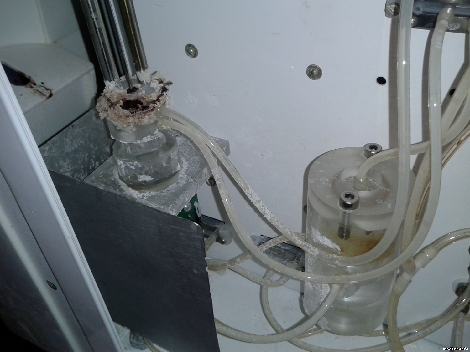 Сам сталкивался с сталактитами на клапане под поршнем пробы. Соответственно на поршне висела солевая "гуля". Дозировал аппарат более или менее ровно, перепад высот там не большой и воздух не подсасывается, не те разницы давлений. Изотон выдавливает через уплотнение при подаче через иглу, сам он не подтекает, а на дозировку это конечно влияет но не сильно. Поэтому и писал "солевой налет". При замене важно затем отцентровать цилиндр м ось двигателя, иначе быстро разобьет уплотнение. В приборах после середины 10 года узел поменяли, центровка обеспечивается кострукцией.