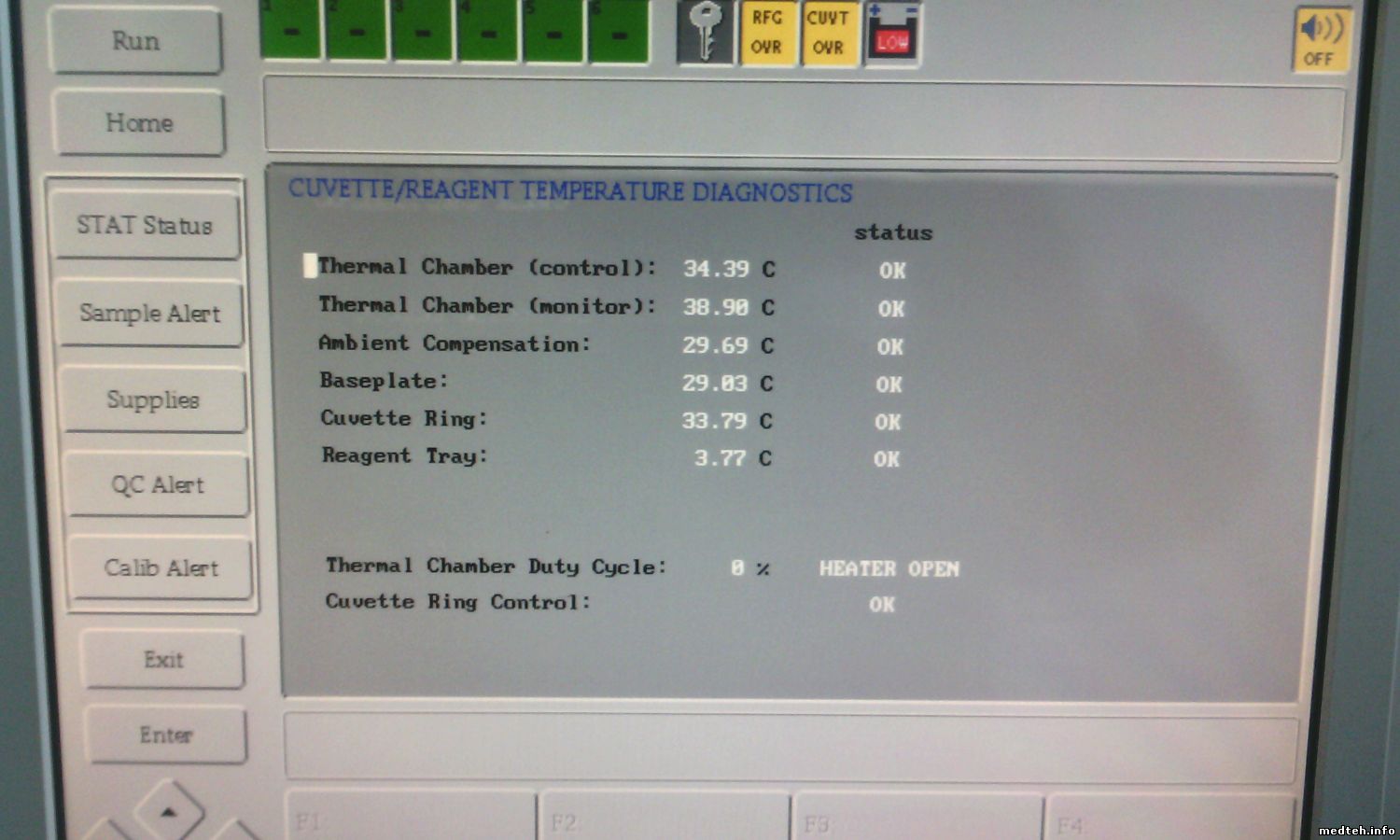 [b]scratch2010 ] Исправность датчиков контроля проверяется из главного меню F4-F5-F8. Если на полеF8 вот такая картинка, то неисправен нагреватель кювет. Там нихромовая спираль, термопредохранитель и биметалический контакт. (характерная неисправность). Сзади термокамеры разъемJ23 контакты 2и3. Запустить анализатор можно на время ремонта из главного меню F6-F8.Загорятся желтые значки реагента и кювет.