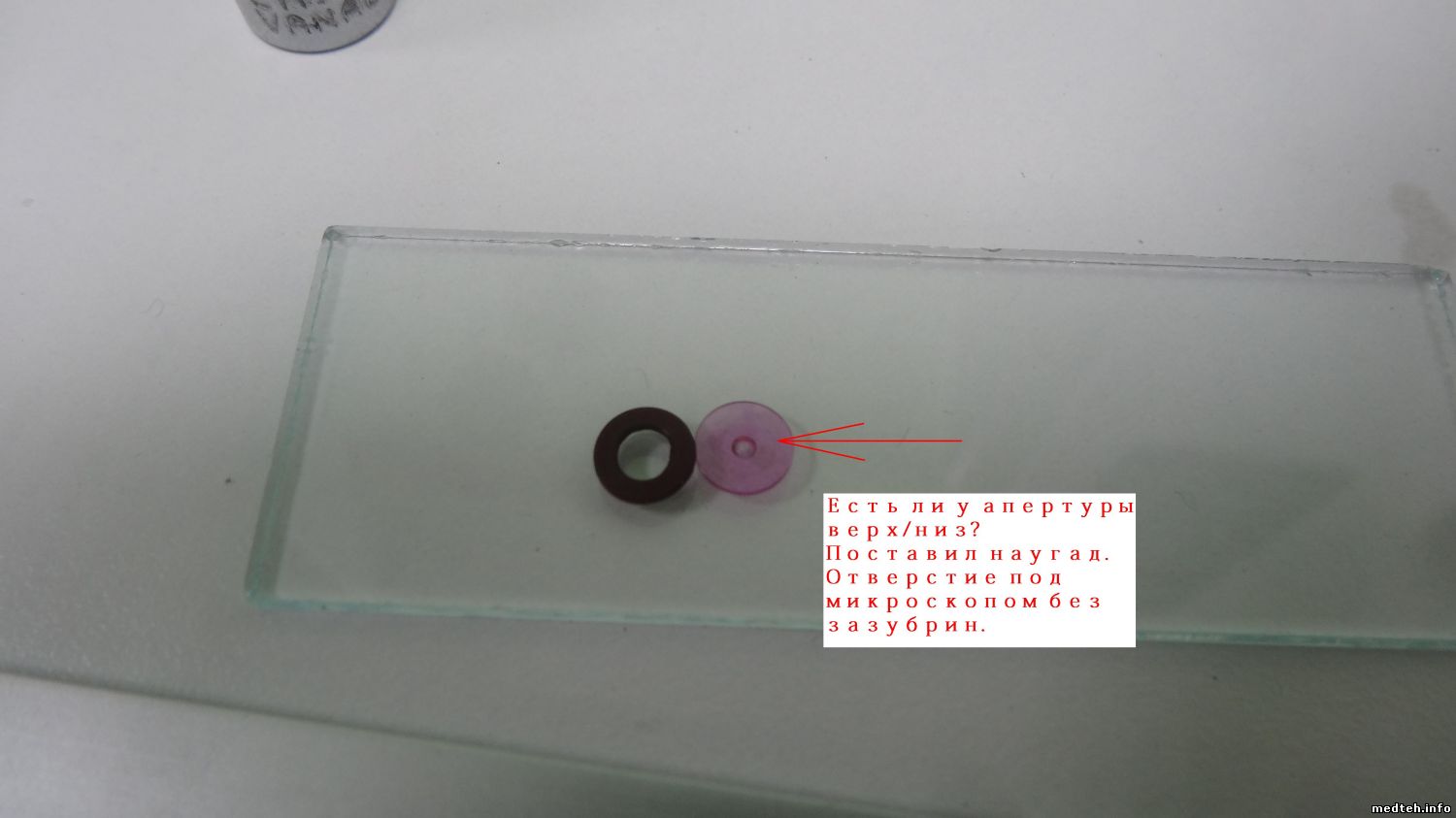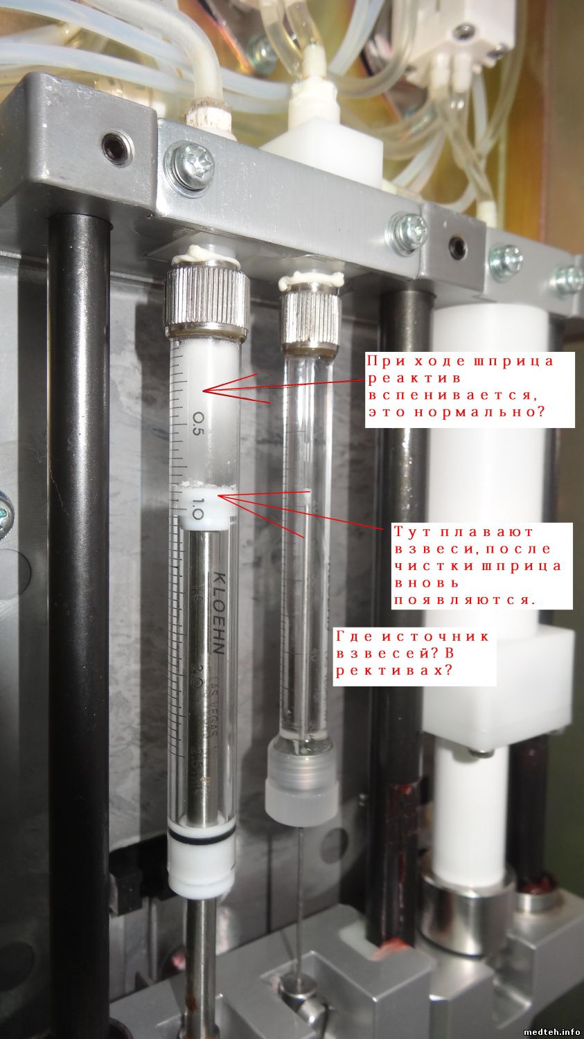 Здравствуйте. Прошу помочь с решением проблемы. За три последних дня работы анализатора время измерения WBC стало падать с 12,5 сек. сначала до 8,5, потом 5,5, сегодня только 0,0...0.5 сек. Мои деиствия: 1. Поменял реактивы от заведомо исправного аппарата. 2. Снял, посмотрел апертуру WBC под микроскопом, края красивые, не рваная. 3. Прочистил шприц 2,5 мл от взвесей. 4. Разобрал все клапана, порывов резинок не обнаружил, на резинке клапана SV6 шприца 2,5 мл. стер серый налет. 5. Отвез аппарат в другое ЛПУ, поставил рядом с исправным и увидел следующее: - при заборе пробы и подсчете времени WBC - в канале WBC реактив льет струей в течение 5 секунд (см. фото), а в исправном - медленно подает воздушный пузырь. - в исправном аппарате нет белых взвесей в шприце, а в моем как ни чистил шприц (снимал, разбирал, промывал) - взвеси опять появляются (см. фото). Вопросы: 1. При одновременном срабатывании клапанов SV18, SV8 при измерении пробы льет струя. Почему? Проследил по трубке откуда подает - с апертуры WBC. 2. Посмотрел апертуру, поставил на место, закралось сомнение - есть ли разница, какой стороной ее устанавливать? 3. Что является источником взвесей в шприце 2,5 мл.? Разбирал его 3 раза, чистил. Перелил лизирующий раствор в стеклянную бутылку - взвесей нет. Сталкивался кто-нибудь с подобной проблемой? Прошу подсказку.