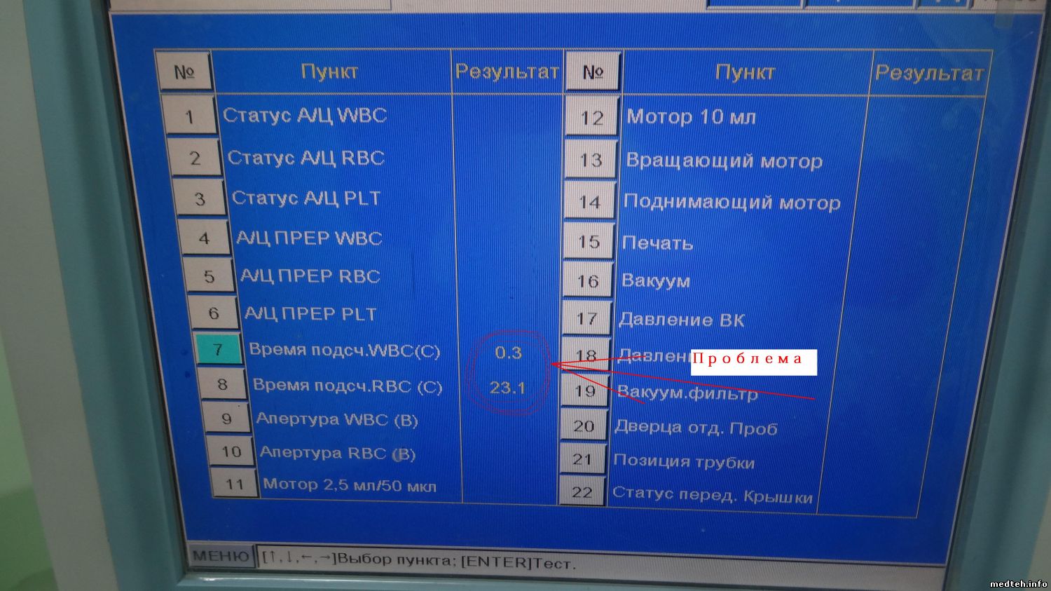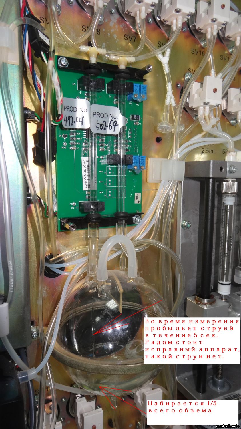 Добрый день! Я бы подошел к неисправности следующим образом: 1. Убедился визуально: бежит ли миниск столба жидкости в волюмитрической трубке. 2. Убедился, в том что столб жидкости в волюмитрической трубке бежит без пузырей. 3. Убедился в исправности оптодатчиков регистрации миниска столба жидкости. Далее будет понятнее и проще. Наличие волюметрических трубок для гематологического анализатора - это огроменный плюс прибора, надо пользоваться эти плюсом.