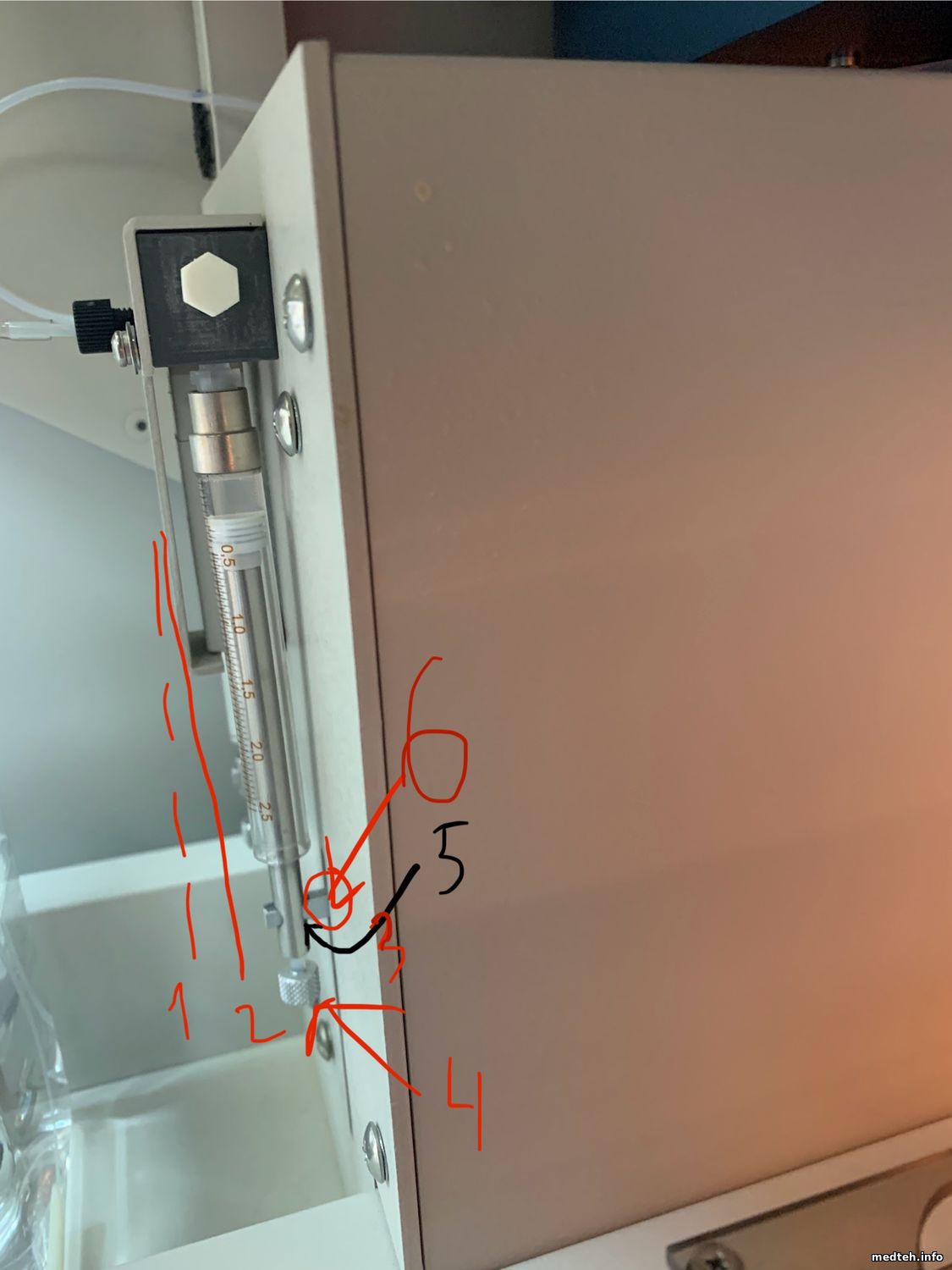 Нижний держатель (4) ослаблял, немного отодвинул от заднего упора (5) наружу, но такое ощущение, что теперь поршень под углом двигается, когда набирает (хотя он и до этого так делал, но стабильно на месте шприц не стоит).