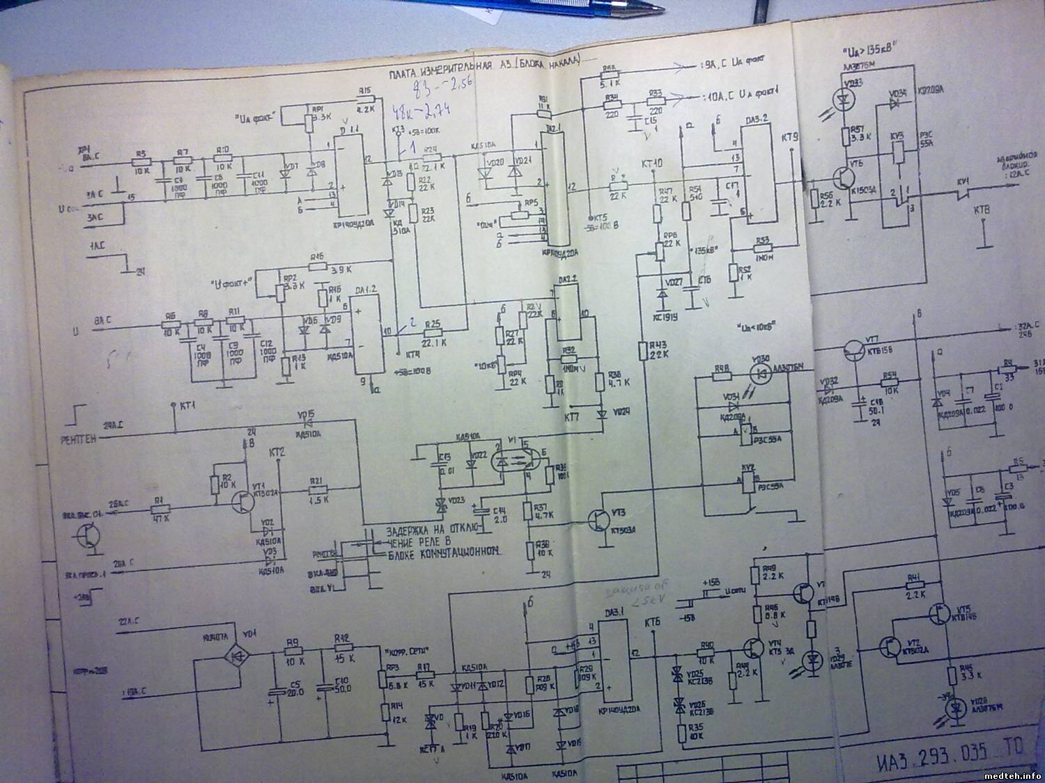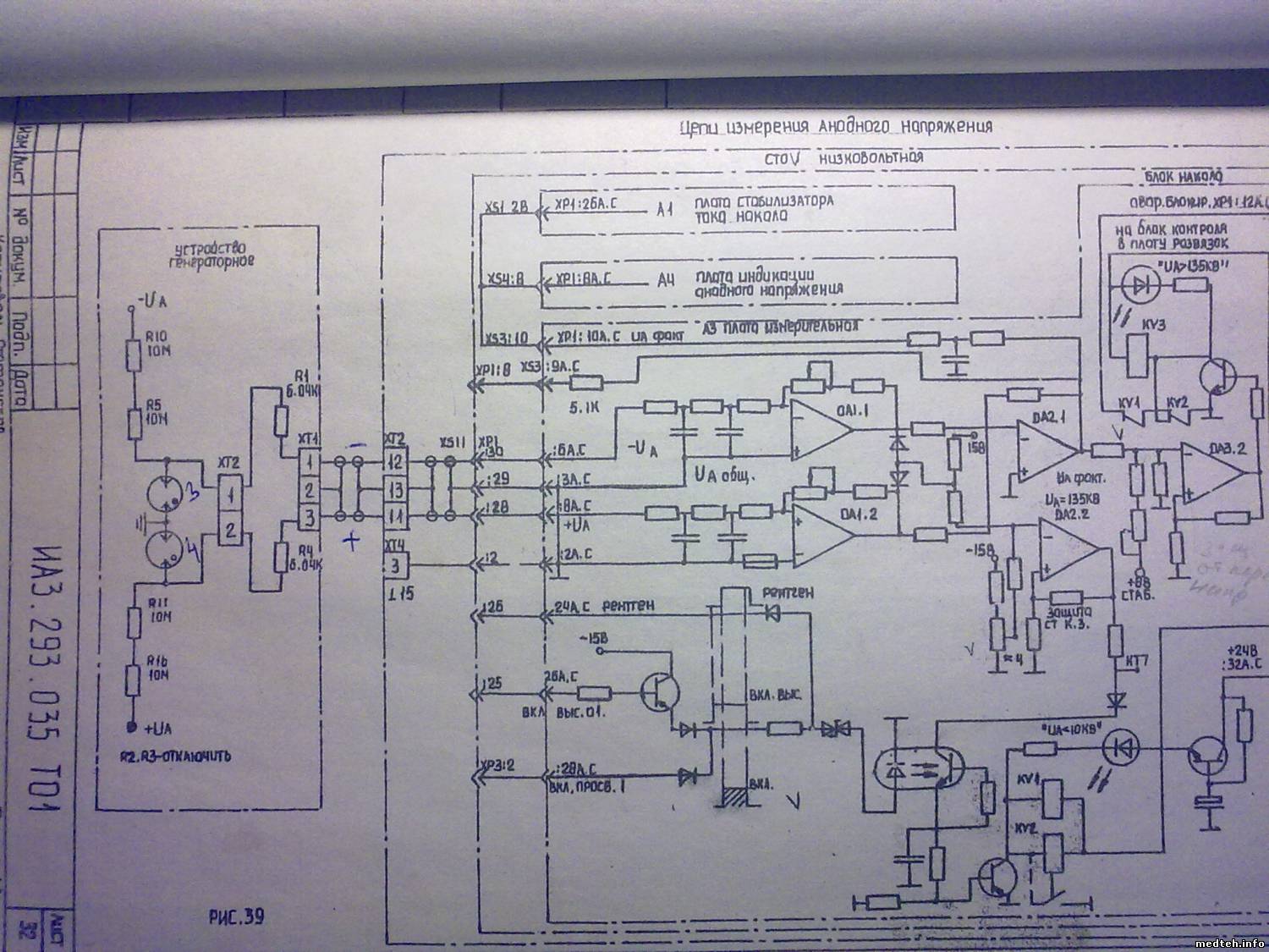 Здравствуйте уважаемые! Попал на Рентген-47 с УРП-5-1, до меня его "поковыряло" две конторы. Но самое обидное, что документацию уперли, а кто мед персонал и сказать не может. Общая симптоматика выглядит так: 1. аппарат включается (это радует). 2. при попытке выполнить снимок (графия) загораются светодиоды "ошибка" и "Ua>135" 3. при включении скопического (на графии) режима ошибок не выдает, слышно как включается подкрутка анода, но на приборе тока не показывает; 4. в режиме "имитации" снимок проходит. Что проделано: 1. перечистил все доступные разъемы 2. протянул все болты 3. передернул все платы и промыл разъемы спиртом 4. снял диафрагму и обнаружил воздух в излучателе (просачивался под расширительную резинку, перезарядил, воздух убрал) Завтра поеду поставлю на место. Но если не поможет, без документации этого зверя не осилю. Может подскажете чего уважаемые.