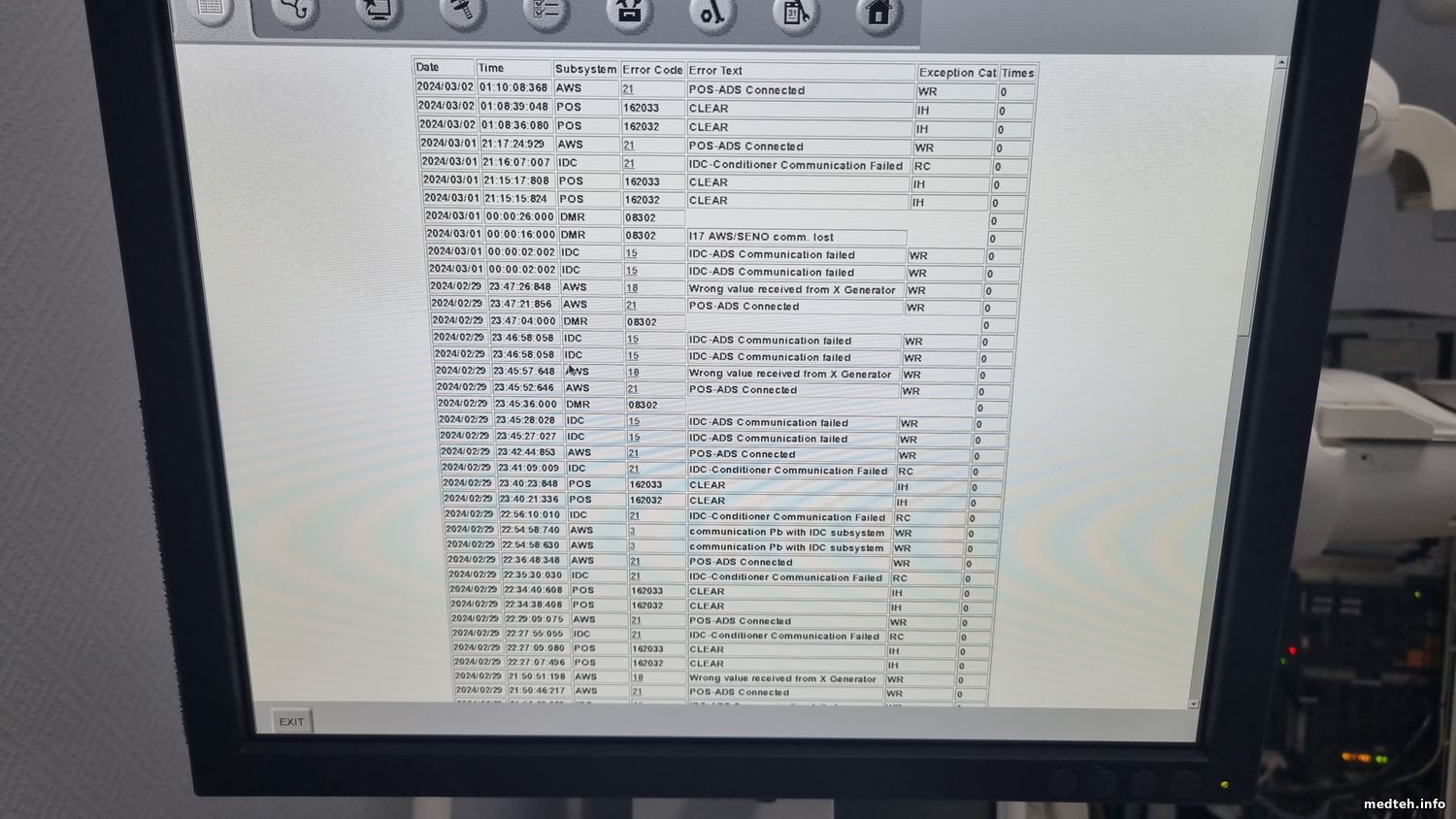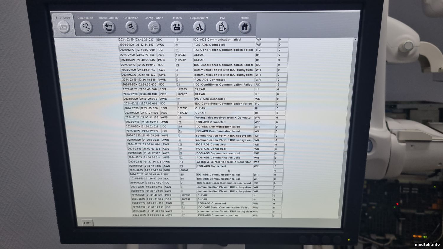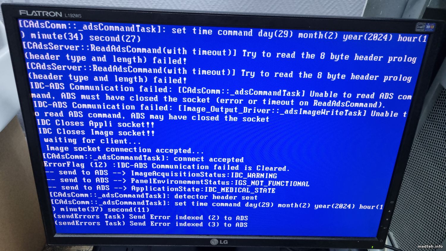 Однажды аналогичная проблема была из-за выключенного в кабинете кондиционера и того, что ушел уровень воды в охлаждающем контуре детектора (бачок в генераторе). Сейчас вода на уровне, температура 26,6 по термометру генератора (требуемое значение от 25,5 до 34,5). В еррор лог пишет, то Detector Enviroment Fail, то IDC connection fail, то ничего не пишет, а приложение всё равно дальше не грузится.