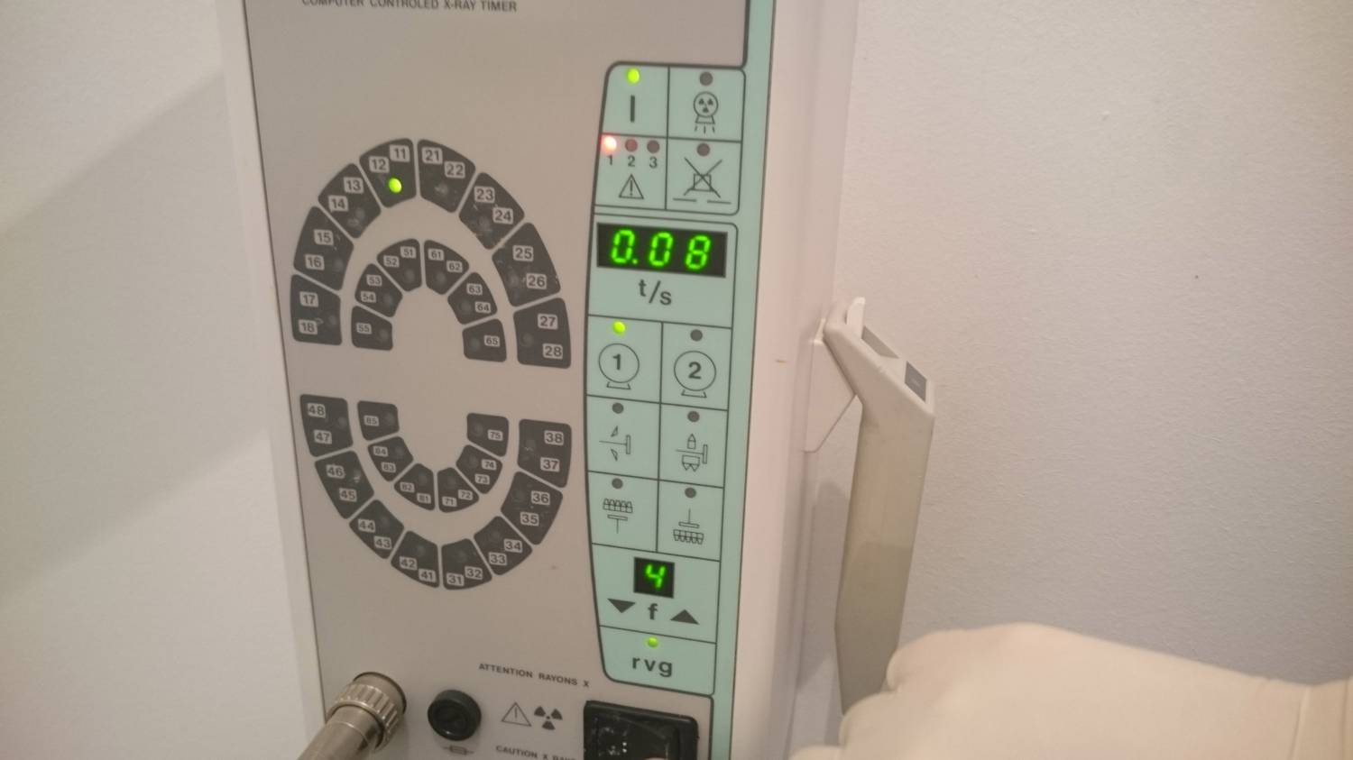 При попытке произвести снимок, радиовизиограф выдает ошибку с аудио-оповещением. Горит красный индикатор ошибки в поле 1.