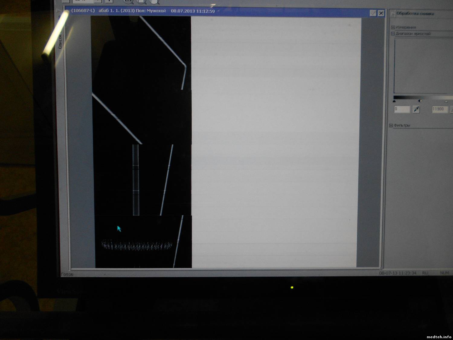 Коллеги помогите советом. Просканн 7000: на полученном снимке нижняя половина черная. Вначале такие снимки появлялись изредка, а теперь наоборот изредка проходят нормальные снимки. Предполагаю неисправность платы,расположенной в детекторе, либо платы сопряжения в ПК (вставлена в разъем РСI ПК). Кто знает как снимается сигнал с линейки детектора и передается в ПК?