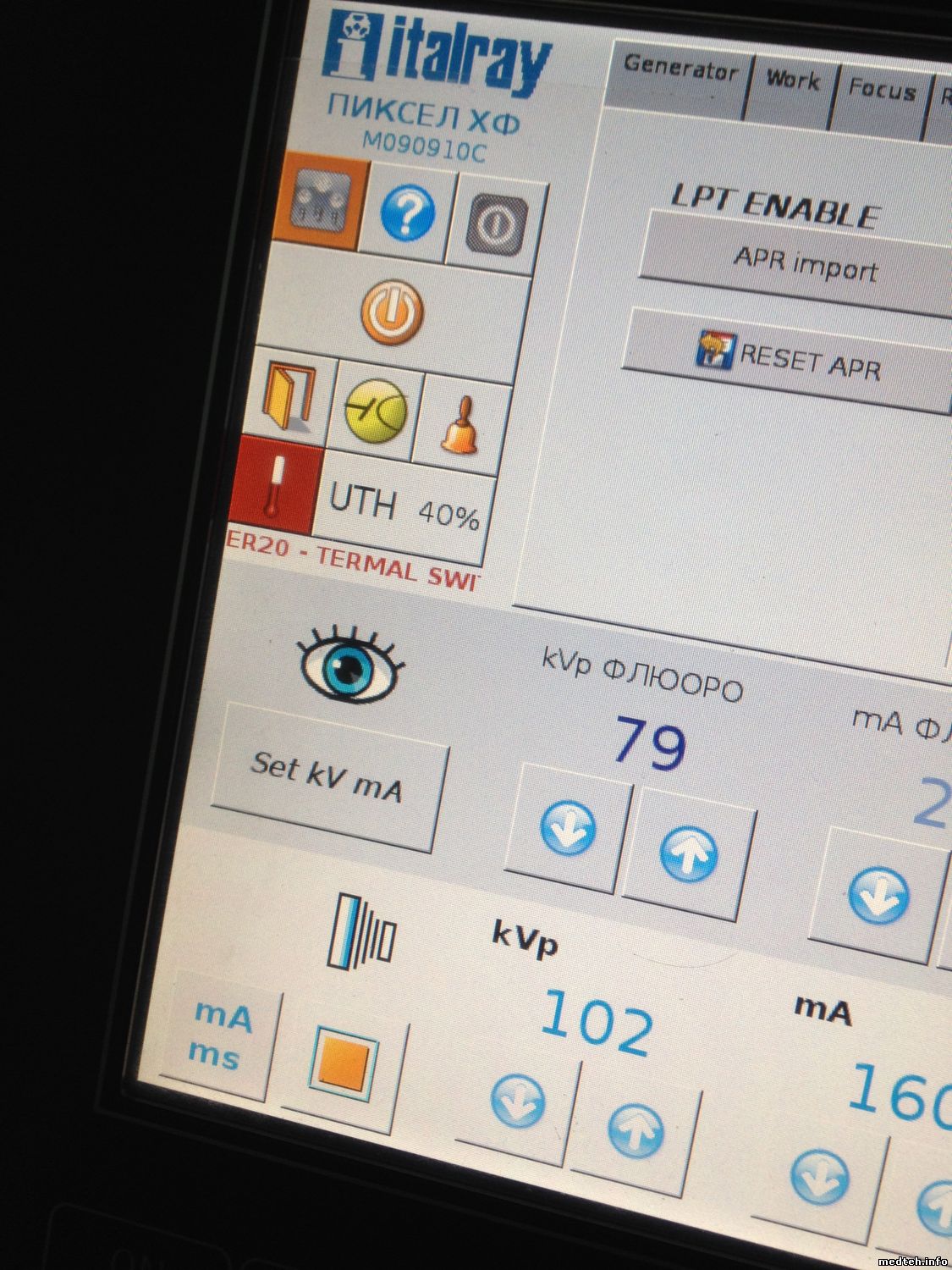 -Начал смотреть 06 -rotor fault, 07 - filament fault, 08 - beam fault, 20 - termal switch, 22- door open, 53 - high large filament stanby current. Так как времени было немного - все ошибки как бы косвенно указывают на трубку. Прошёлся согласно мануалу в меню по всем пунктам настроек-там всё в порядке(в самом начале остались фото настроек), дальше - включил скопию,и начал смотреть что к чему(лучше самому увидеть всё), при нажатии на педаль слышно вращение анода, но потом он (прошло около1.5мин и он остановился, при этом педаль нажат была), скопия пошла(режим скопии 79кв на 2.3ма), попробыал сделать снимки(100кв на 150ма ), пошли снимки но после 12 снимков получил эти ошибки и UTH 46%. По сути на 1 снимок получается 4% UTH, как доказывали врачи у них раньше максимум за 20-30 снимков UTH достигало 15%. При снимках анод разгонялся, как бы всё в порядке, но не совсем. А получается перегрев на лицо, перегрев линейный, то есть не скачут цифры, с каждым последующим снимком идёт увеличение UTH на 4%. Но смутило то что во время скопии анод не вращался. В реальности трубка еле еле тёпла .В силу малого остатка времени на этом и закончилось. На следующий день врач снова захотел попробовать(а мало ли постоял отдохнул), включил скопия пошла, зарядил кассету и начал делать снимки. Далее оказалось что снимки пустые(скопия есть, а снимков нет), UTH 0% и анод вращался. На этом по сути и вся история.