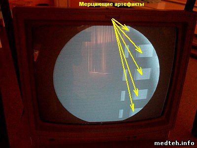 Здравствуйте, форумчане. Сразу скажу, что я не рентгенщик, а проблема сложная. Есть старый РДК "Вымпел" со штативом Jugorentgen и УРИ Электрон 612п. Аппарат проблемный и все время ломается, особо часто штатив. На этот раз проблема с УРИ, а именно мегаконтрастное изображение на экране (в скопии), т.е. настолько контрастно, что, например, из грудной клетки видно будет только самые труднопросвечиваемые участки костей и это при просвете в ручном режиме. Соответственно, автоматический режим экспонирования совсем не работает - экран мерцает и едва-ли вообще что-либо видно. Снимки на пленке при этом получаются нормальными, т.е. дело в приемной стороне. Также на экране появляются мерцающие артефакты, да и вообще изображение может мерцать в зависимости от картинки. Я сделал пару снимков и видео дефекта со снятой камерой, чтобы самому не "светится" - дефект на видимом свете ровно такой же, изображение на экране правда немного размыто. Обратите внимание как странно ведет себя камера - изображения либо нет вовсе, либо резкий переход (без полутонов).