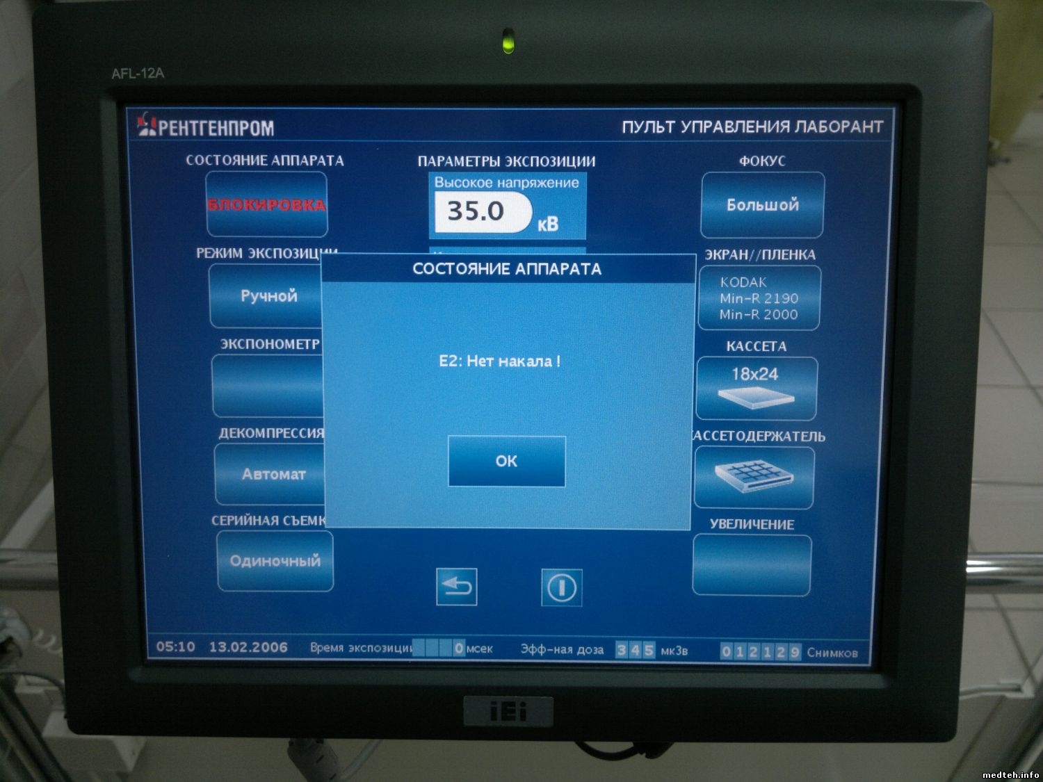 Маммограф МАММО-РП-Амико (аналоговый) 2011 г., не тот что аналог Альфы, а якобы собственная разработка Рентгенпрома. При включении в пункте "Состояние аппарата" высвечивается "блокировка", если нажать на неё, то выдаётся сообщение "Е2: Нет накала". Сама трубка целая, лезть дальше проблематично из-за отсутствия документации и того, что я явно далеко не первый кто его разбирал, есть явные следы неквалифицированного вмешательства (например единственный провод одного из блоков просто висит в воздухе и не понятно куда он вообще должен подключаться).