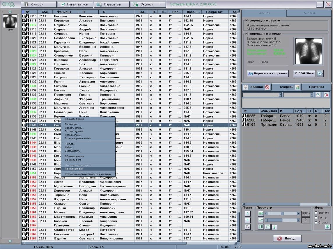 1. Переименовываем файл «Диск базы:\Exams\Exams.dat». 2. Переименовываем файл «Диск базы:\SaveExams\Exams.dat». 3. Переименовываем файл «Диск резервной базы:\Exams\Exams.dat». 4. Переименовываем файл «Диск резервной базы:\SaveExams\Exams.dat». 5. Переименовываем папку C:\Program Files\DIRA\SaveConfig. 6. Запускаем DIRA. На появившееся сообщение о том, что будет создана новая база, отвечаем - «Да». 7. После загрузки DIRA открываем журнал (не снимки). 8. В верхней части окна ПО DRA щёлкаем два раза подряд лево кнопкой мышки по надписи «Software DIRA v. 2.8.0069». В появившемся меню давим на «Restore database» (восстановить базу). Начинают добавляться в базу записи со снимками, но этот процесс не отображается (висят песочные часы). 9. Далее, когда все файлы в папке ELI будут просканированы, в журнале появятся все записи. Если снимков много, то этот процесс будет несколько длительным. У добавленных вновь в базу записей номера будут синего цвета. Если перезагрузить DIRA, то они станут в основном красными (чёрными, зелёными). 10. Врачам, нужно будет все эти снимки описать вновь. Но не через шаблоны, а через «Параметры пациента», т.к. протоколы будут тоже восстановлены (протоколы лежат в пути «Диск где лежит база:\ RTF\). 11. Всё, база восстановлена по снимкам *.ELI, что должны находиться во время восстановления в пути «Диск где лежит база:\ELI\. Сколько файлов *.ELI, столько в базе должно быть записей (если в файле *.ELI не будет информации о пациенте, то такой снимок не будет добавлен в базу, его, если это необходимо, можно добавить отдельно). • Если при открытии журнала вы видите пустой лист (нет разлинованных столбцов), это значит, что столбцы все сдвинулись, в одну линию, влево. Наведите курсор мышки на первую линию шапки таблицы (так чтоб появилась двойная горизонтальная стрелочка), где обычно находился условный номер снимка, и, зацепив мышкой разделительную вертикальную линию, раздвиньте столбцы вправо. Если у вас новая версия DIRA, то раздвинуть столбцы можно по команде из меню, которое вы вызываете, щёлкая правой кнопкой мышки по пустому журналу. • Если есть и столбцы и строки в журнале после восстановления, то вероятно снимки без данных о пациенте. Откройте любым текстовым редактором файл ELI и посмотрите содержание заголовка, где должны быть данные, чей это снимок.