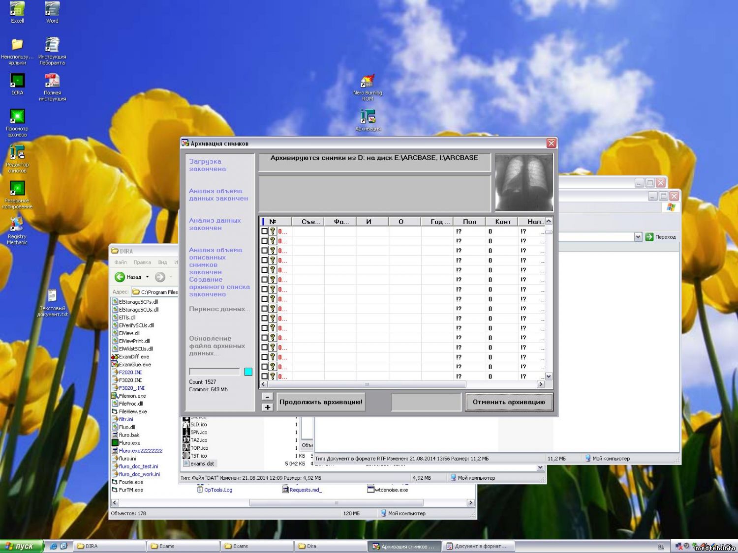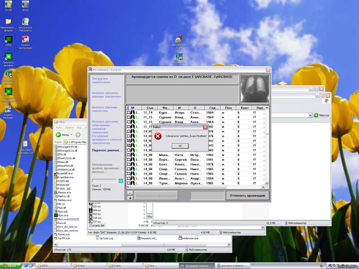 1. Файл exams.dat не readonly? То есть дира удаляет {*.rtf,*.txt,*.eli,*.bmp} для снимка но не может его снести из exams.dat? А в экзам дат что после этого меняется? Его можно переташить в hiew и notepad и посмотреть что изменилось. Имена пациентов различимы. Они исчезли? (пологаю нет) В хиеу можно сравнить до архивации и после. Что изменилось. Можно сюда выложить их (до и после, три файла будет). Также полезно fluro.ini и до кучи для архивации. Вдруг...