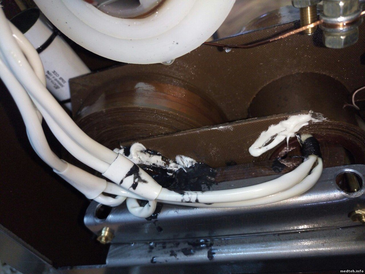 Прошу помощи с аппаратом 12ф9, нет готовности, горит нет накала. Но работал и раньше с этой надписью :unknown:. Всего началось с заменой высоковольтных кабелей, они вышли из строя. Камеру проверил, готовность приходит на мку, мку тоже была заменена. На плате накала светодиод загорается и тухнет ( при включении аппарата) . Заменил я на плате накала оптопару HCNW3120 и транзистор КП707А1 ( смотрел осциллографом, показывал хрень). На входе в бак, показывает 0,6 ОМ. Разобрал бал, возле трансформатора обнаружил черную слизь, вопрос что это ?