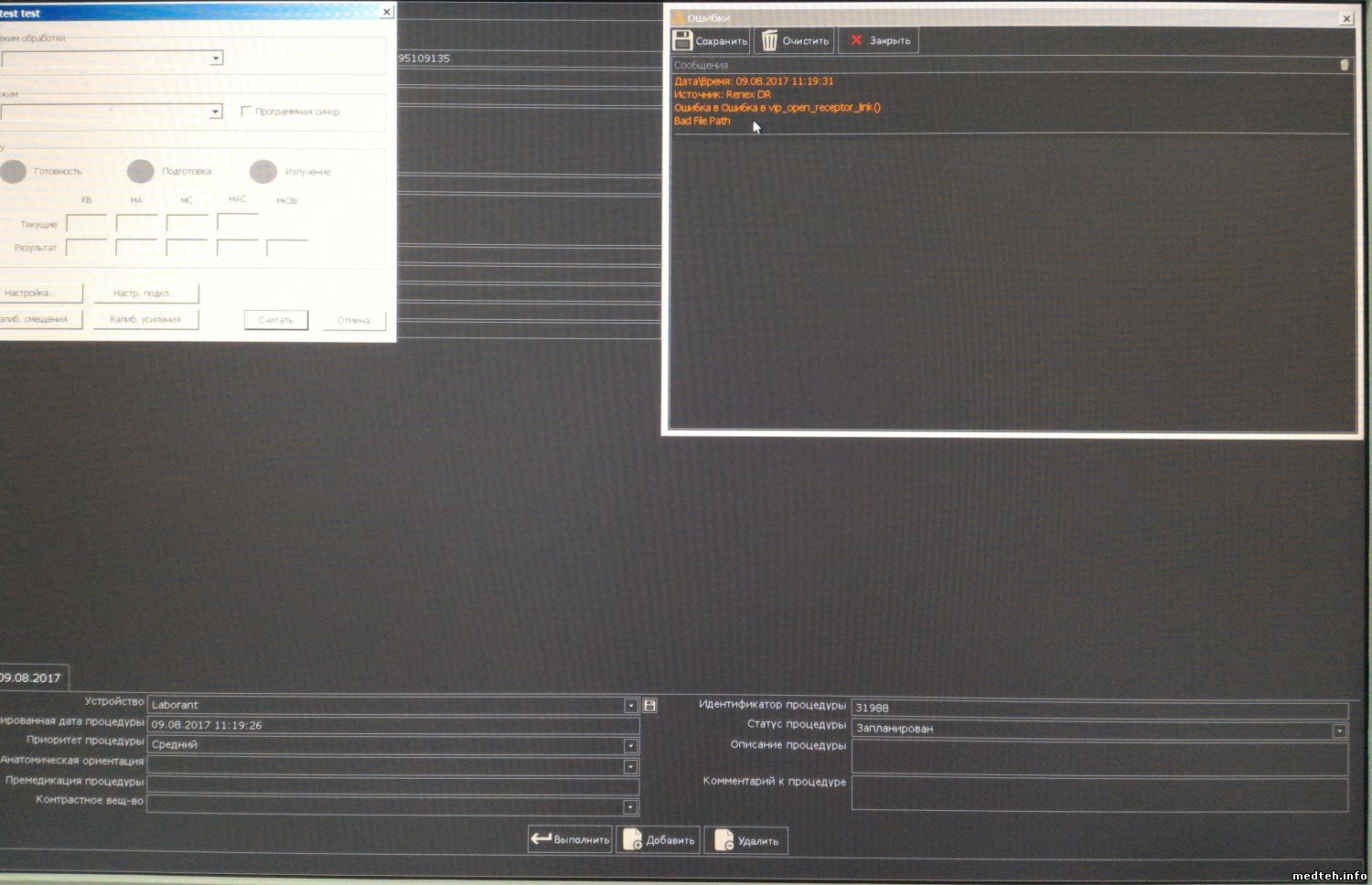 Тема: Флюорограф «РЕНЕКС-Ф5000». Коллеги, день добрый! Простите, что пишу в этой теме, просто новый пользователь и пока я не напишу 3-и сообщения, новые темы публиковать не могу. Я сама инженер по медицинскому оборудованию, сама айтишник. Описание: На компьютере лаборанта флюорограф «РЕНЕКС-Ф5000» выдал ошибку "0e/8a/01". См.фото - https://disk.yandex.ru/i/9imm5tQmKdqj1A Просто есть желание в этом разобраться :) .