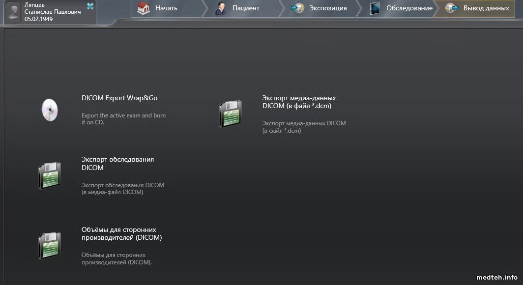 Для выгрузки объёма используются другие пункты: в медиафайл dicom (с вьюером для просмотра), для 3-х производителей (для импорта в сторонние программы), в файл .dcm (просто куча файлов цифра.dcm в количестве 509-650 файлов в зависимости от аппарата, объёма и режима съемки).