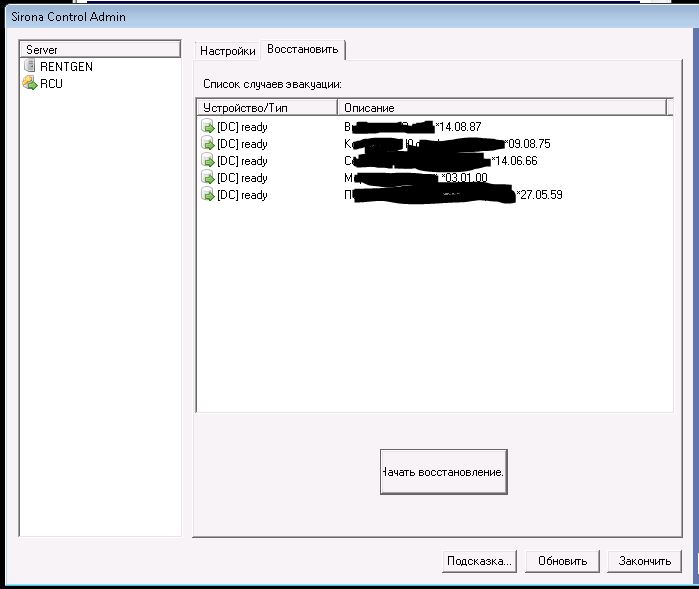 Программа Sidexis XG версия 2.2 В один прекрасный день стала зависать программа при заведении пациента. На RCUServer путём удаления переустановил программу. Проблема не решилась. Обнаружил, что стал сыпаться диск на сервере баз данных. Поменял диск переустановил Win, но теперь при запуске программы и заведения пациента говорит: "В настоящее время на этом компьютере не зарегистрирован ни один рентгенкомпонент. (3059)".