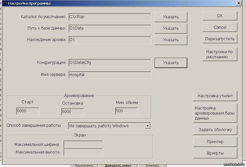 Настройки программы: 1. Имя базовой конф. = Base 2. Локальные данные = C:\XRAY 3. Конфигурация = пусто 4. Способ завершения работы = Выключить питание компьютера 5. Архивирование = DVD-RAM 6. Старт = 5000, Остановка=6000 Мин. объем=500 7. Резрешить переключение БД = галочка снята