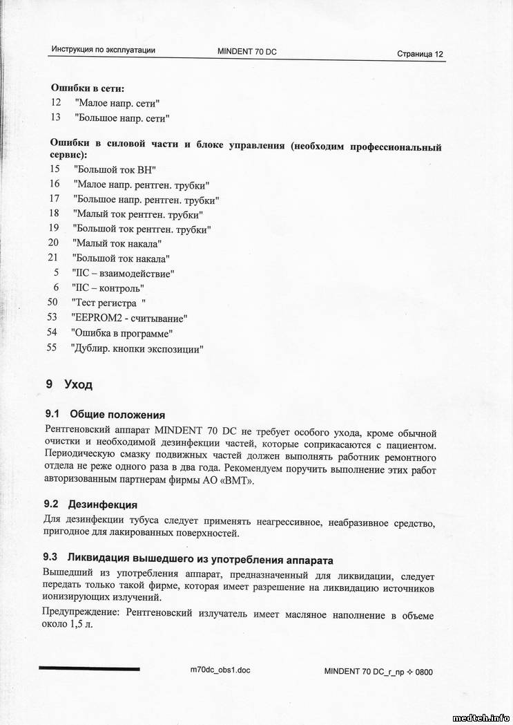 УНИВЕРСАЛЬНОЕ РЕНТГЕНОВСКОЕ ПИТАЮЩЕЕ УСТРОЙСТВО “РЕНЕКС 2У-МП” ОШИБКИ СОДЕРЖАНИЕ АС-01 - Нет +5В стойки АС-02 - Нет +15В стойки АС-03 - Нет связи со стойкой АС-04 - Нет меандра 50Гц фазы А АС-05 - Нет нуля на выходе предустановки АС-06 - Вскрытие портов. Предустановка не запускается АС-09 - Обрыв накала АС-10 - Перекал АС-11 - Не переключился экспонометр АС-12 - Есть ток анода АС-13 - Велико напряжение в средней точке разгона в начале подготовки АС-14 - Нет готовности штатива АС-16 - Ток накала не соответствует (>) коду (больше кода) АС-20 - Окончание снимка по предустановке АС-22 - Сеть не в допуске, меньше (<) 180В АС-23 - Нет записи в РР3 АС-24 - Нет нуля предустановки в конце снимка АС-25 - Нет окончания движения томографа при пробе АС-27 - Испорчена РР3, требуется переюстировка АС-30 - В РР3 нет данных по юстировке накала АС-31 - Ноль в экспонометре больше (>) FF АС-32 - При восстановлении ОРГ-АВТ не происходит запись в РР3. АС-33 - Нет питания разгона анода АС-34 - Не совпадает контрольная сумма таблицы Орган-Автоматики в РР3 АС-36 - Ток накала не соответствует (<) коду (меньше кода) АС-37 - Есть напряжение на входе бака до снимка АС-38 - Есть напряжение на входе бака после снимка АС-40 - Реальные mASы после снимка больше (>) 1100 АС-41 - Нет ответа от ТОМО АС-44 - Неправильное чередование фаз ( А 0 -> 1 C =1) АС-48 - Нет сигнала ЭСУ ГОТОВ АС-49 - Есть сигнал ФОТО-СНИМ во время подготовки АС-50 - Нет сигнала ФОТО-СНИМ после подготовки АС-51 - Есть сигнал ФОТО-СНИМ после конца снимка АС-52 - Нет готовности ФОТО-камеры к серии АС-53 - Не собран томограф, томография запрещена АС-54 - Собран томограф, снимки запрешены АС-55 - Скопия. Нет напряжения на входе бака АС-56 - Скопия. Переполнение бака. (Велико напряжение на входе) АС-57 - Неправильное начальное состояние пульта скопии АС-58 - Неправильное начальное состояние кнопок штатива АС-62 - Сеть не в допуске, больше (>) 240В АС-63 - Нет связи с ONIXом АС-65 - Уход сети при томографии