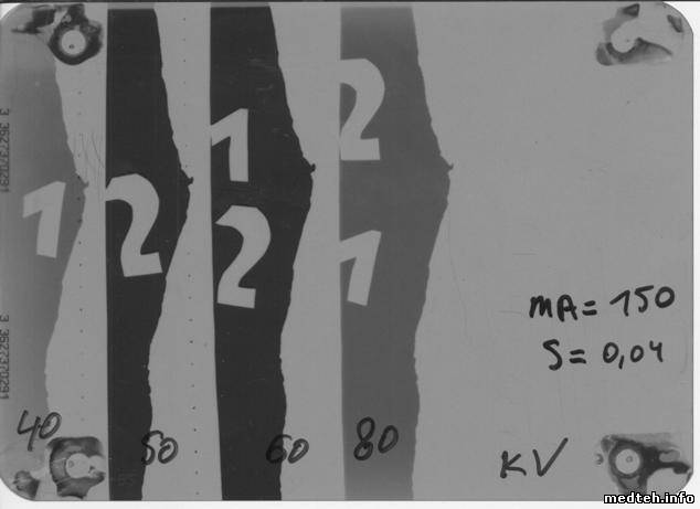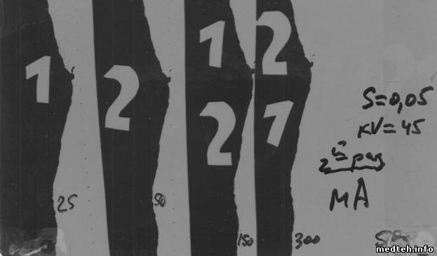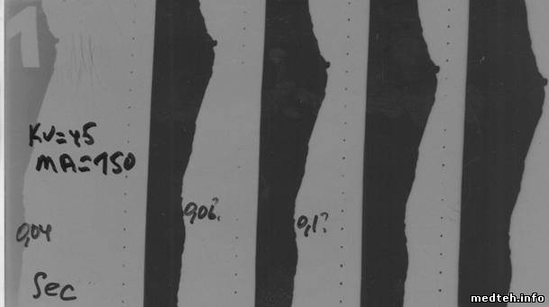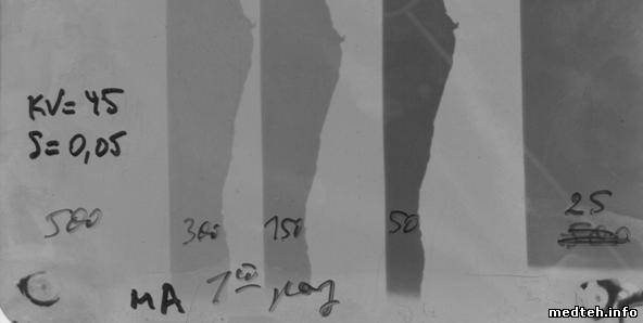 При кВ=45 Сек=0,05 сделал серию при разных мА 1й раз, удивился и повторил 2й раз. Удивился опять. Почему так различаются снимки? Почемуна 1 снимке самый темный - при 50 мА, а при 150 и 300 светлее? На 500 вообще нет снимка, но,возможно, отключили сервисмены. На втором снимке ма=300 той же плотности, что ма=25, мА=50 плотнее их.