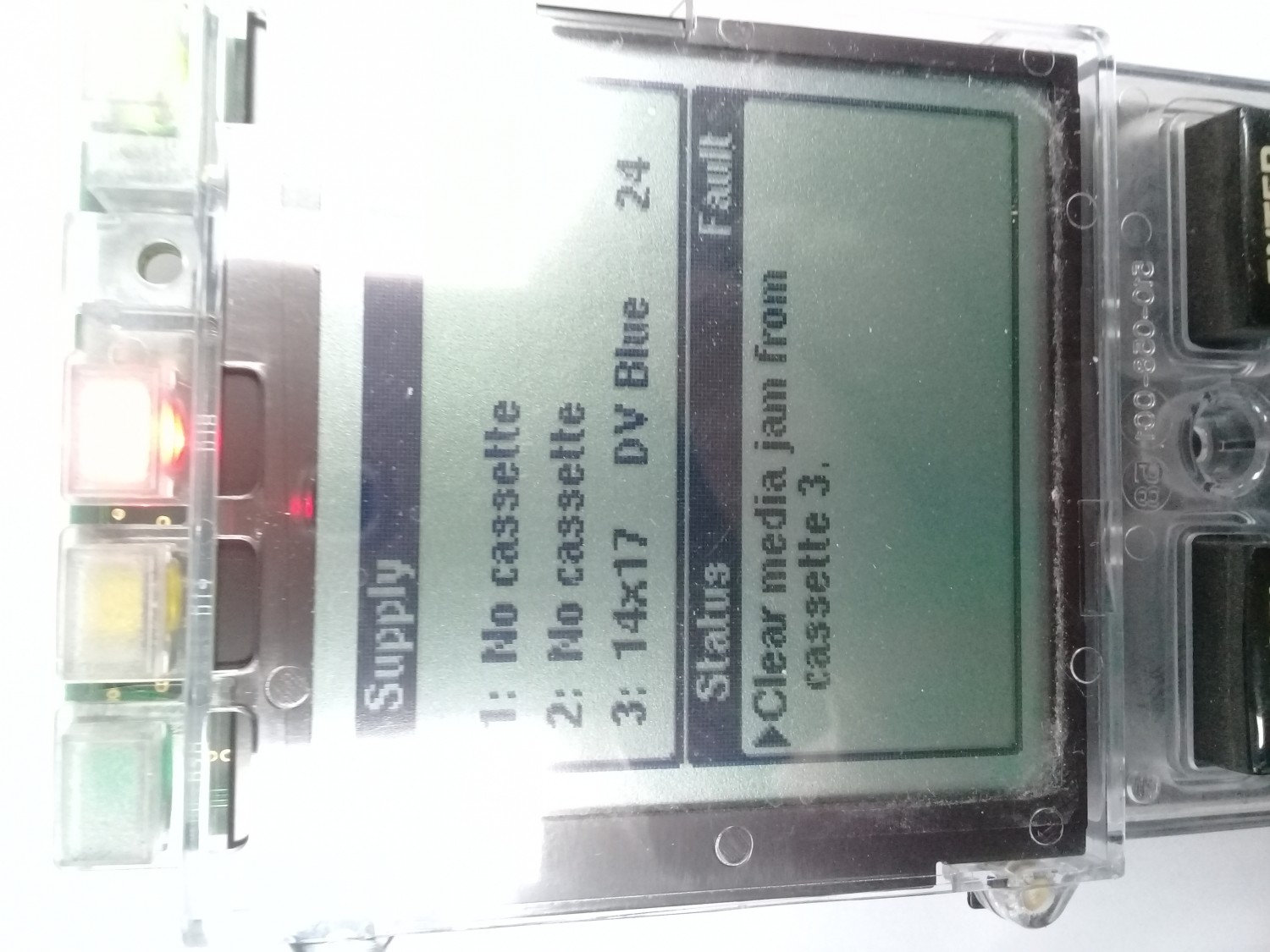 Здравствуйте, всем. Есть несколько принтеров, у которых одна и та же беда - при включении (инициализации), либо, когда уже инициализация прошла и отправляешь на печать тестовую страницу-выдаёт ошибку,которая есть на фотке во вложении. Насколько я помню (хотя могу и ошибатъся), на исправном принтере, в процессе инициализации ролики захвата несколько раз свозят туда-сюда лист плёнки и возвратят обратно в лоток. В данном случае, ролики опускаются несколько раз на поверхность плёнки, но движения нет и после этого выходит ошибка. С кассетами 8х10 и 14х17- одинаково. Заранее благодарен.