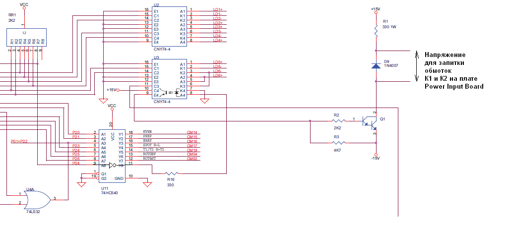Теперь по делу. Стартуют обе системы и канадская и итальянская приблизительно одинаково. Остановимся на итальянском PIXEL HF. Итак, нажимаем кнопку ON на пульте, срабатывают релюхи на плате PXHS010A, и включают схему навесного дер*ма, которая называется "Схема подключения к электрической панели" (тороид с 24В-вторичкой => навесная релюха => контактор 3 фазы на полу). Контактор подает 220 на платы импульсника, который дает +15, -15 и +5 вольт для запитки плат управления ITALRAY. Теперь, чтобы началась подготовка, нужно подать питание на релюхи K1 и К2 на POWER INPUT BOARD. Этим занимается плата PXHS011; ее часть, которая отвечает за запитку К1 и К2, я показал в прикриплении. К тому же я добавил пометки на микросхемы, чтобы функционально показать, че они делают. Итак, что думаешь на вскидку, когда впервые смотришь на схему запуска: -на базу составного транзистора должен прийти какой-то сигнал для того, чтобы открыть его, чтоб он подал напряжение на обмотки К1 и К2; - ага, сигнал берется с микросхемы U3, соответственно на ее 8 ногу, должен прийти "+", чтоб зажечь светодиод, и тогда откроется фототранзистор; - для этого надо чтоб на 9-ую ногу инвертора U11 пришел "-" и...... ...где логика, ведь на 9-ю ногу U11 приходит именно +5V... Вот как раз на моей плате составной трансистор - закрыт. И не дать не взять, схема работает правильно, т.к. на 11-й ноге U1 у меня низкий уровень сигнала (ведь на входе инвертора высокий +5V). Соответственно оптопара закрыта. Конечно, может я тупо запутался, а резистор R2 дает постоянное смещение на сдвоенный эмитерный переход, но тогда зачем городить опторазвязку и пр. Кстати, на плате между эмитером и базой Q1 у меня 0V.