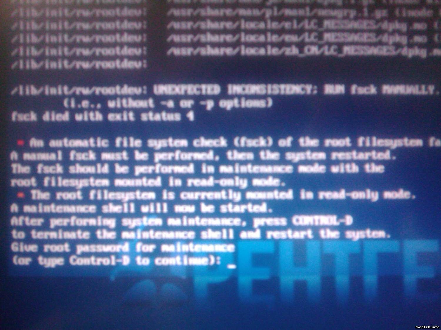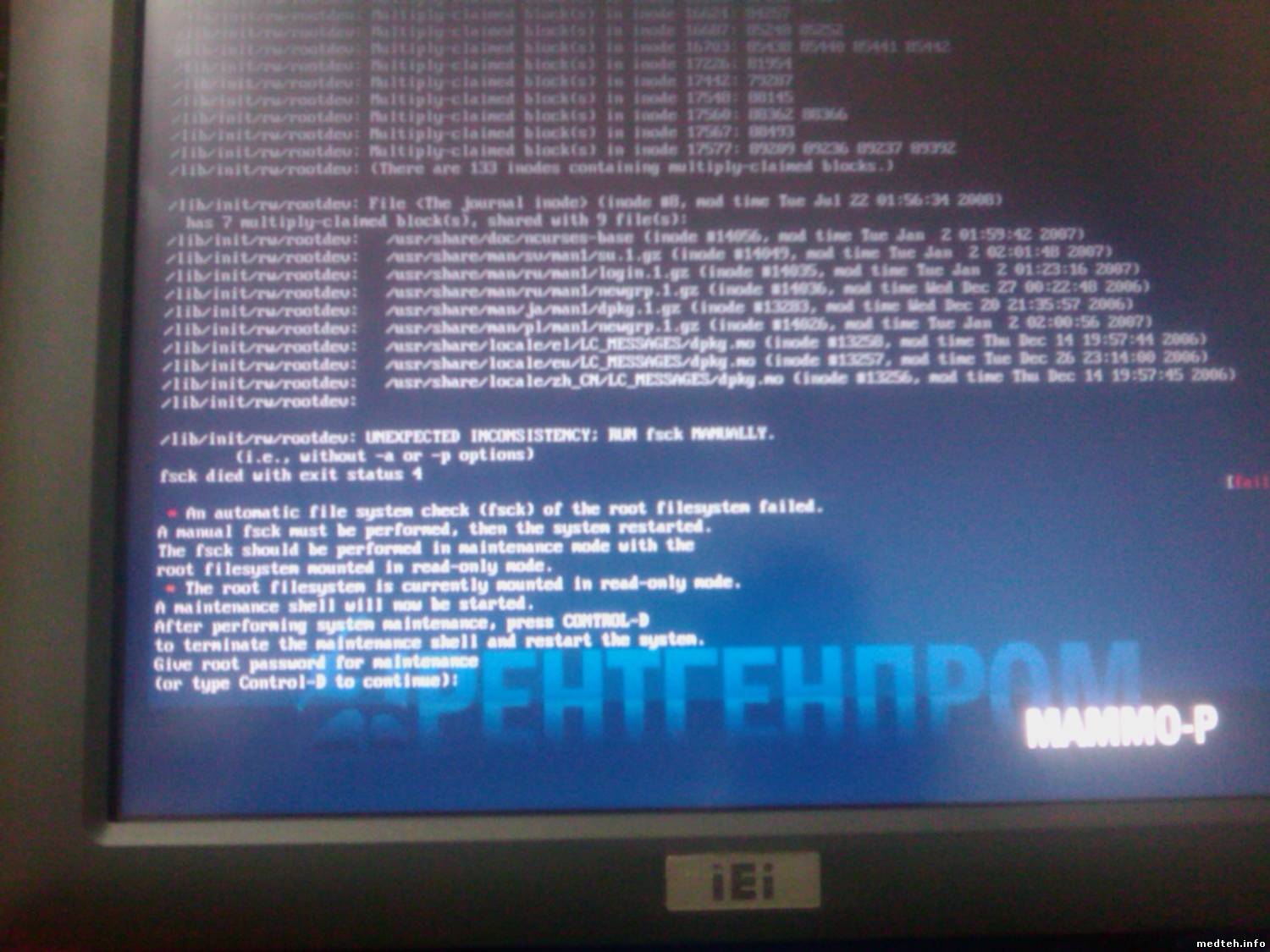 На маммографе МАММО-Р-Амико не загружается ПО, зависает на этапе движения горизонтальной полоски, где-то 10% и тёмносиний экран и просит нажать КТРЛ-Д, перезагружается и просит пароль.