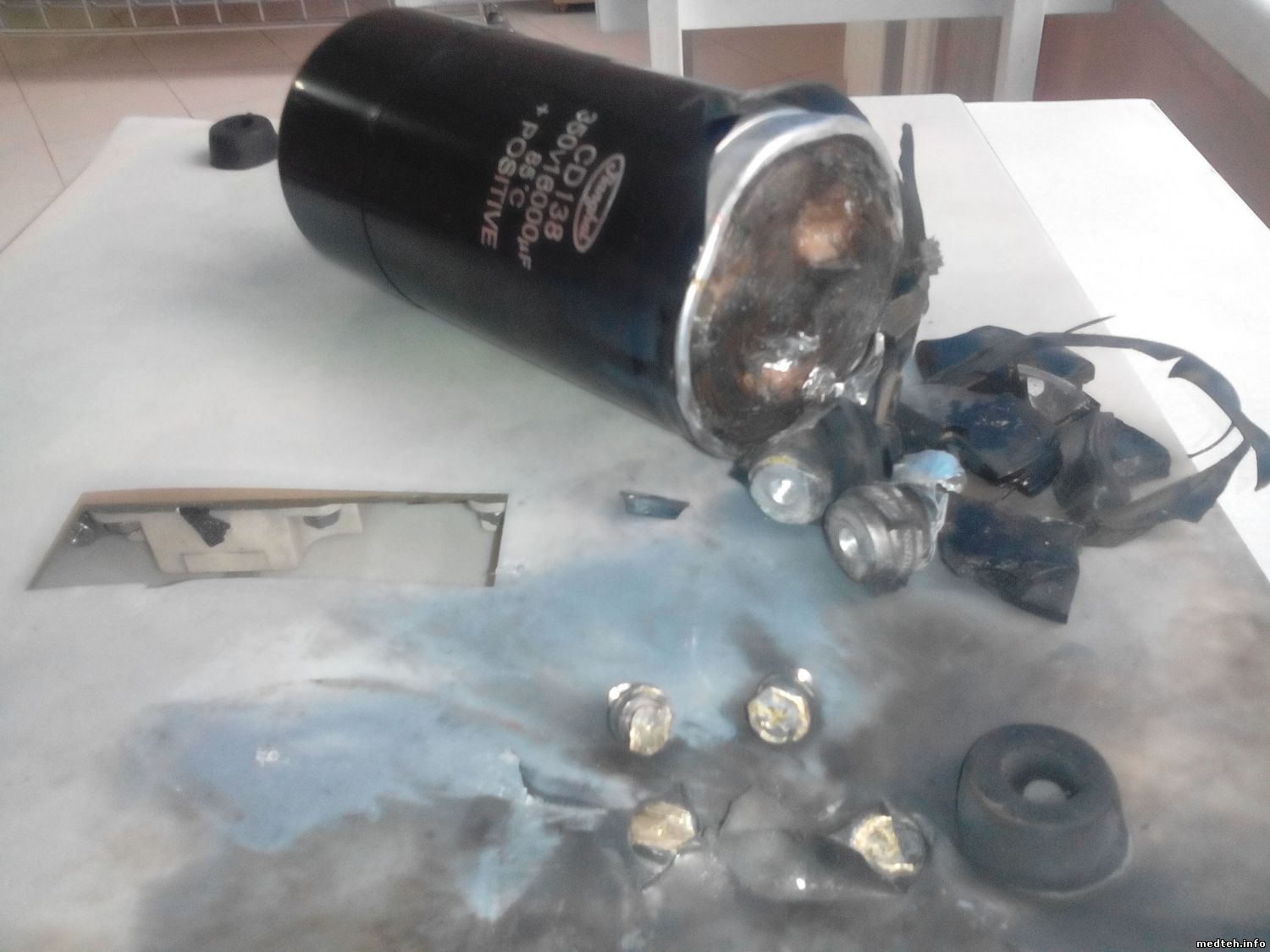 Рванул накопительный конденсатор CD138 350V 16000uF. Контакты взорванного конденсатора пробили тонкую изоляционную плёнку и всей накопленной энергией, оставшихся в живых конденсаторов, приварило свои винты на шасси. Оторвать, лёгким движением руки, шасси от блока накопителей не удалось. Пришлось отогнуть шасси, на сколько это было возможно и с помощью реноватора срезать плюсовой винт, а минусовой сам отвалился. Прилагаю фотографии...