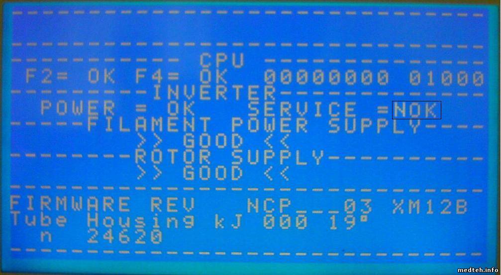 Подскажите кто знает. При включении маммографа он нормально включается, но через пару секунд после появления нормального окна работы на дисплейчике уходит в сервисный режим. Из сообщений на экране сервиса везде "ок" кроме 'service' там "nok" видимо не ОК. Иногда аппарат включается и делает несколько снимков, но потом все равно уходит в режим сервиса. Кто подскажет что смотреть в этом случае, какой узел? Связывался с сервисом ТМО , пока сказали только чистить разьемы. Только их уже до дыр зачистили . Фото не мое, просто в редакторе изменил вид как у меня. Проблема на фото выделена прямоугольником