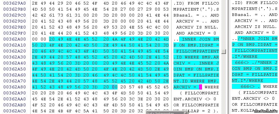 каждый запрос выполняется около 2m 36s, итого до 10 минут, чтобы открыть снимок из архива Варианты решения: 0) замена сервера тесты на 8 ядерном Intel Xeon улучшили время запроса с 3 минут до 2,5 1) повреждена сама база всякие gbak, gfix никак не исправляли ситуацию 2) лезть в базу и как-то переделывать индексы вьюхи какие индексы тут еще могли помочь непонятно 3) лезть в сам exe-файл и править текст запросов как ни странно, самый жесткий способ и помог открываем в любом hex-редакторе PR1000.exe ищем строки INNER JOIN BMP ON BMP.IDPAT = FILLCOMPPATIENT.ID WHERE BMP.ARCHIV = INNER JOIN BMP ON BMP.IDPAT = FILLPATIENT.ID WHERE BMP.ARCHIV = и меняем их на /*NNER JOIN BMP ON BMP.IDPAT = FILLCOMPPATIENT.I*/WHERE 666<> /*NNER JOIN BMP ON BMP.IDPAT = FILLPATIENT.I*/WHERE 666<>