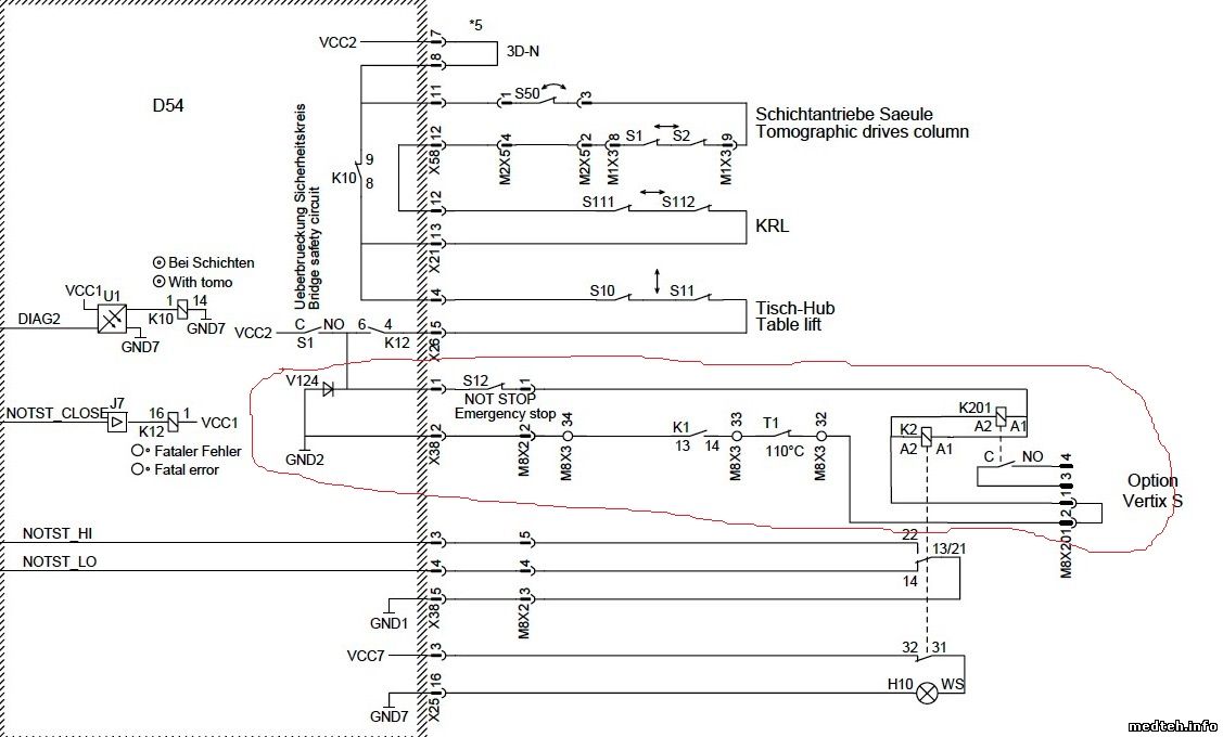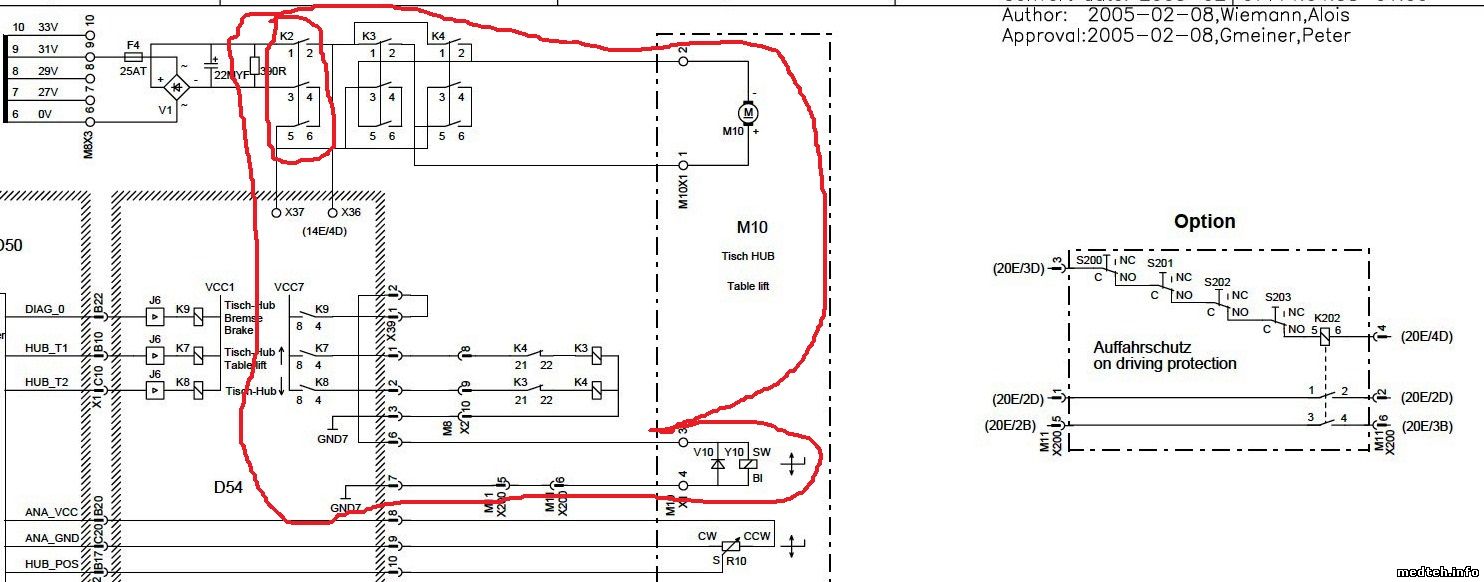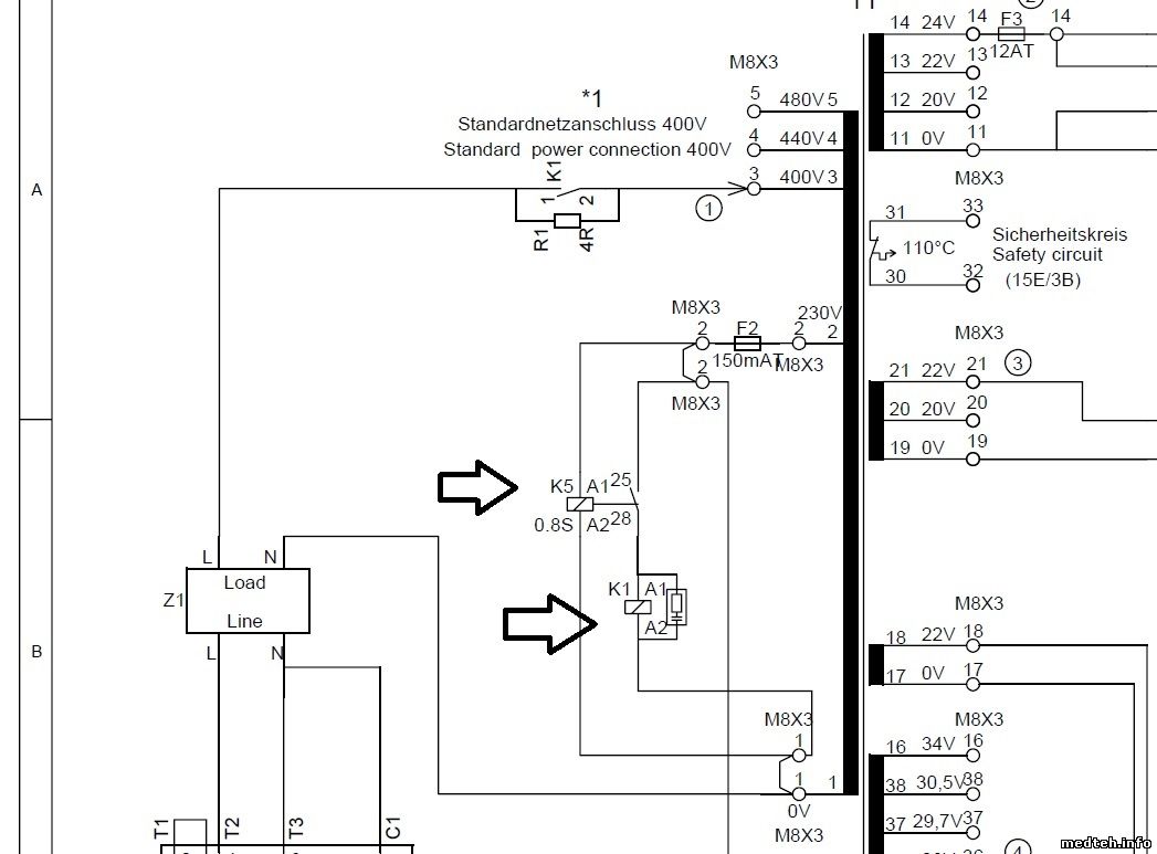 K2 (15E/4B) Sicherheitsschütz / контактор безопасности- через него подается питание на мотор подъем опускание стола, далее К3,К4, при включенном аппарате (исправном) всегда включен.
