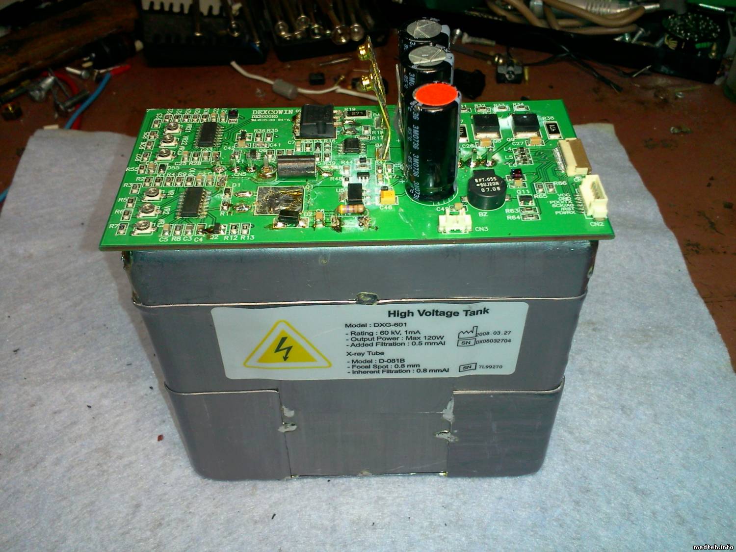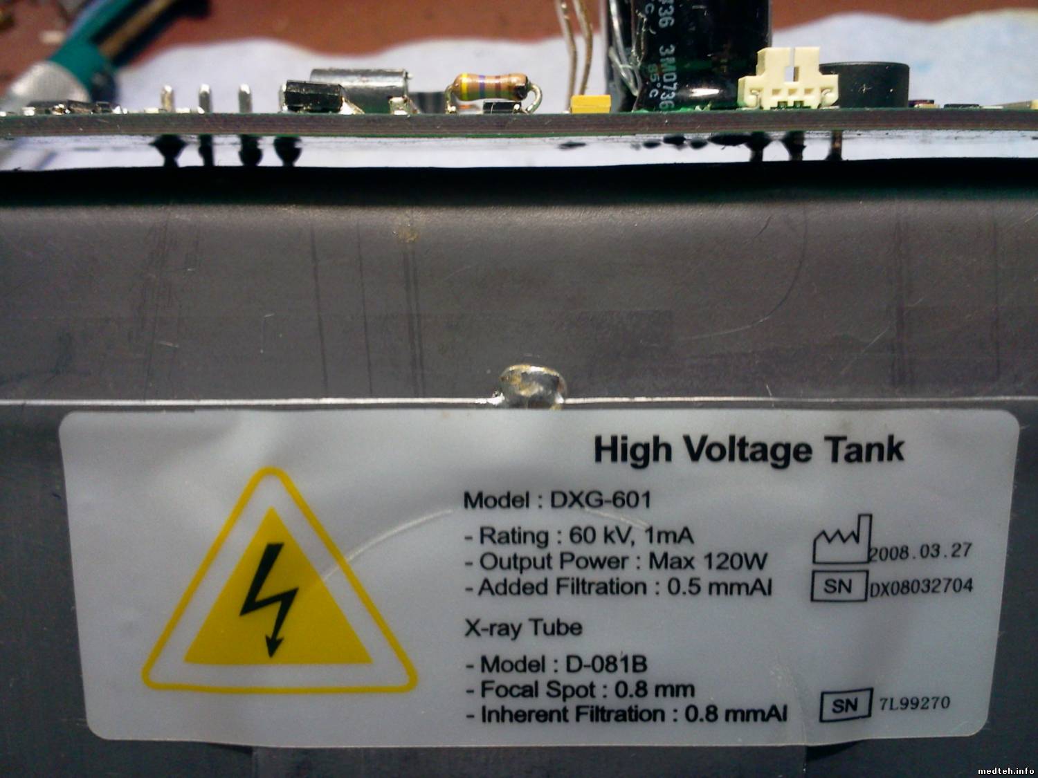 Принесли мне сий агрегат в нерабочем виде. При попытке сделать снимок он просто выключался. При вскрытии обнаружил внутри два винта, один из которых закоротил мощный транзистор(даже приварился!). После того как всё восстановил симптомы такие - в момент снимка если выдержка более 0.6 сгорает транзистор B80NF55 который что-то питает в трубке(не знаю что!). Все генераторы работают нормально (проверено без нагрузки). Винты внутри оказались от оторванной ручки сбоку, следовательно делаю вывод что аппарат уронили. По этому поводу вопрос - может кто сталкивался с блоком High Voltage Tank модель DXG-601. Надо узнать распиновку этой штуки и что там внутри. Спасибо