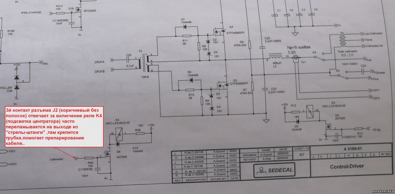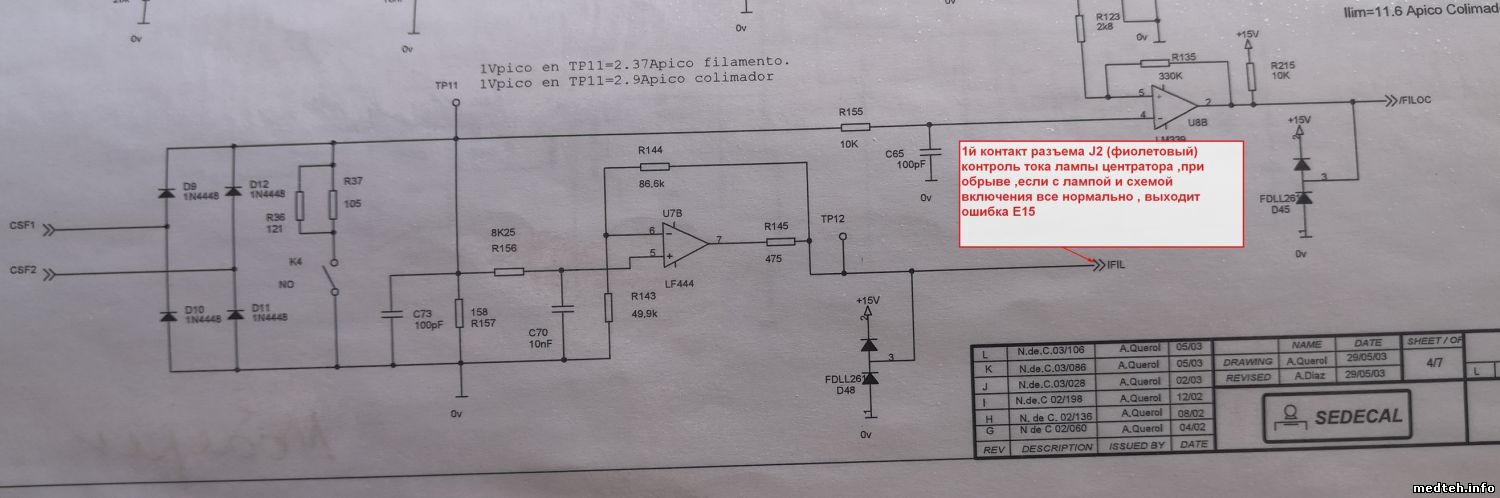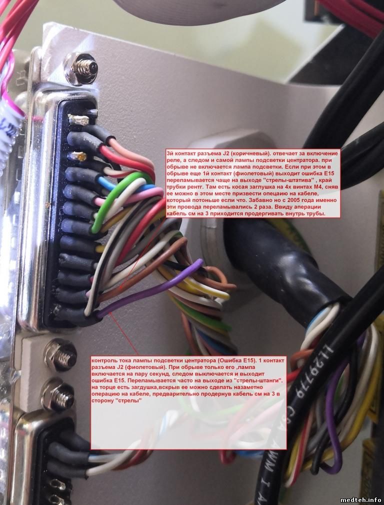 Е15 Если кому интересно на моем мт/4 2006г. выпуска уже дважды переламывался кабель управления. На выходе "стрелы" штатива ,если можно так назвать, та ее часть к которой крепится сама трубка. Конкретно переламывался коричневый провод - это включение лампы подсветки. Фиолетовый провод -это контроль тока лампы центратора , обрыв его так же провоцирует ошибку Е15. Если лапа не загорается так же выходит ошибка Е15 ( в моем случае из за обрыва коричневого провода ,разъем J2 control-driver). Не знаю почему но другие провода как то живут , а именно эти 2 чахнут чаще... На выходе "стрелы" штатива есть косая заглушка на 4 винтах М4 , за ней можно и сделать операцию на кабеле , заранее сдвинув кабель в сторону штатива сантиметра на 3-4 . Там впоследствии и оставить "инвалида" ,заглушка закроется и ничего видно не будет. кабель конечно с 2х раз стал короче , но работать еще можно подвижность трубки сохранилась.