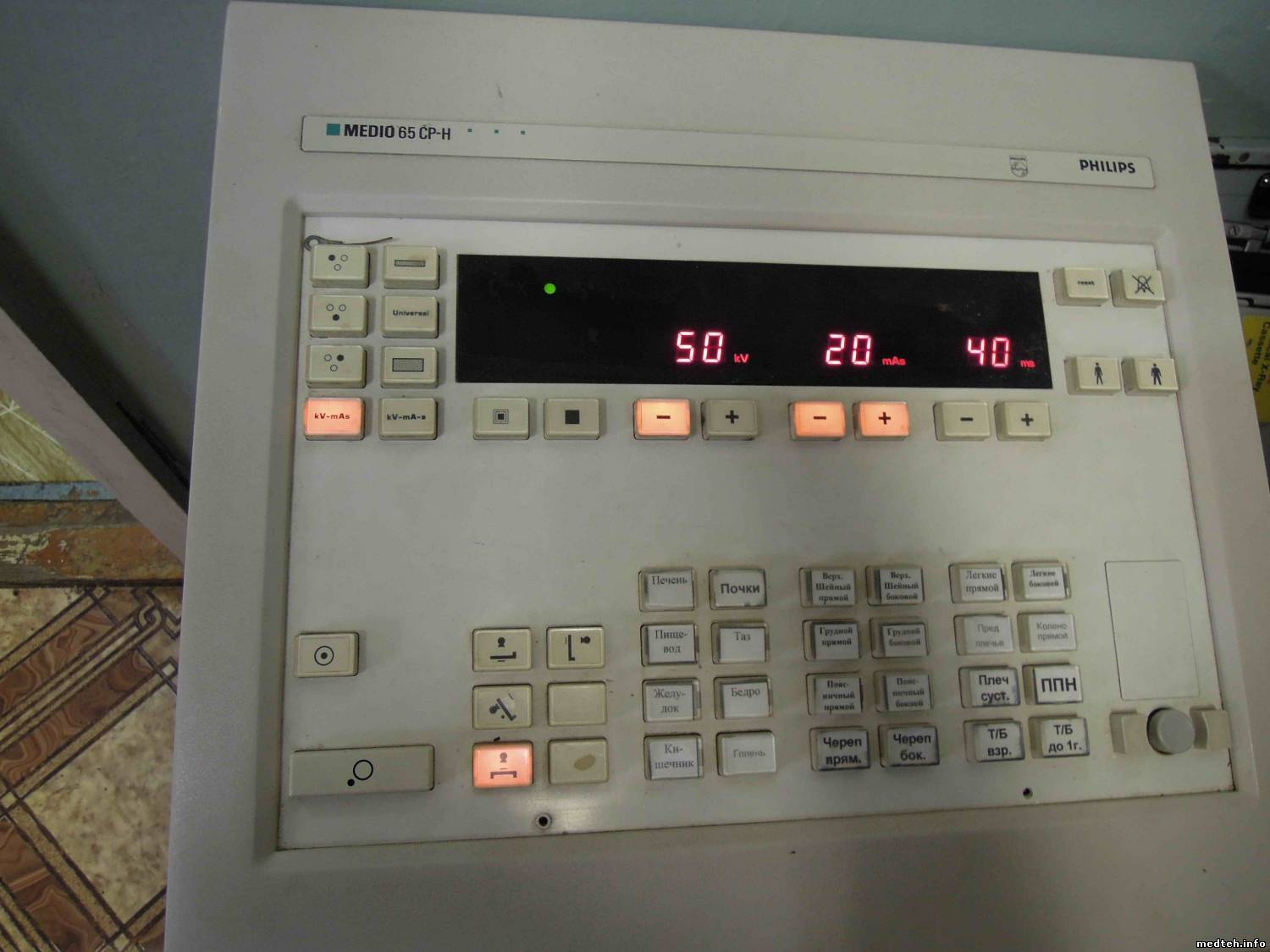 Аппарат состоит: питающее MEDIO 65CP-H, вертикальная стойка с решёткой 9848 500 20401 (кассетодержатель с оптопарами), ПСШ DIAGNOST 56 c решёткой графического места 9804 609 51102 ( кассетодержатель с потенциометрами).