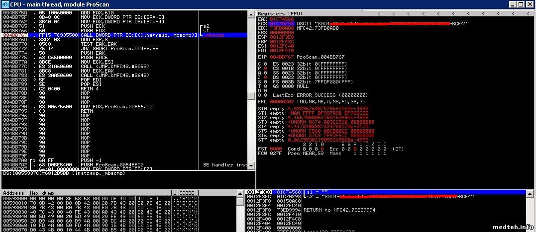 Смотрим какие процедуры находятся по адресу Proscan.004C1180: GetActiveWindow, ReleaseCapture - захват мыши, подготовка окна... это не то что нам нужно Смотрим что по адресу Proscan.004BBF32, несколько комманд выше располагается вызов _mbscmp. Идем на http://msdn.microsoft.com и смотрим что это такое. Compare strings - сравнение строк, может быть это то, что нам нужно? ставим брэкпоинт, проверяем в проскане.