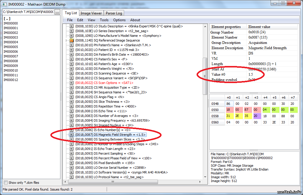 Показывает (0018,0087) DS Magnetic Field Strength = <1.5>