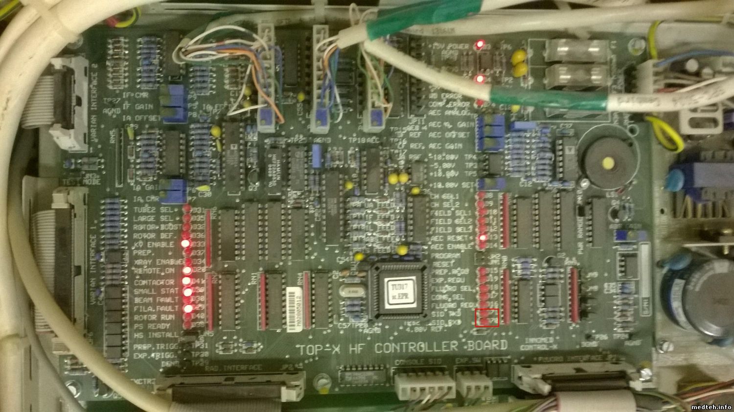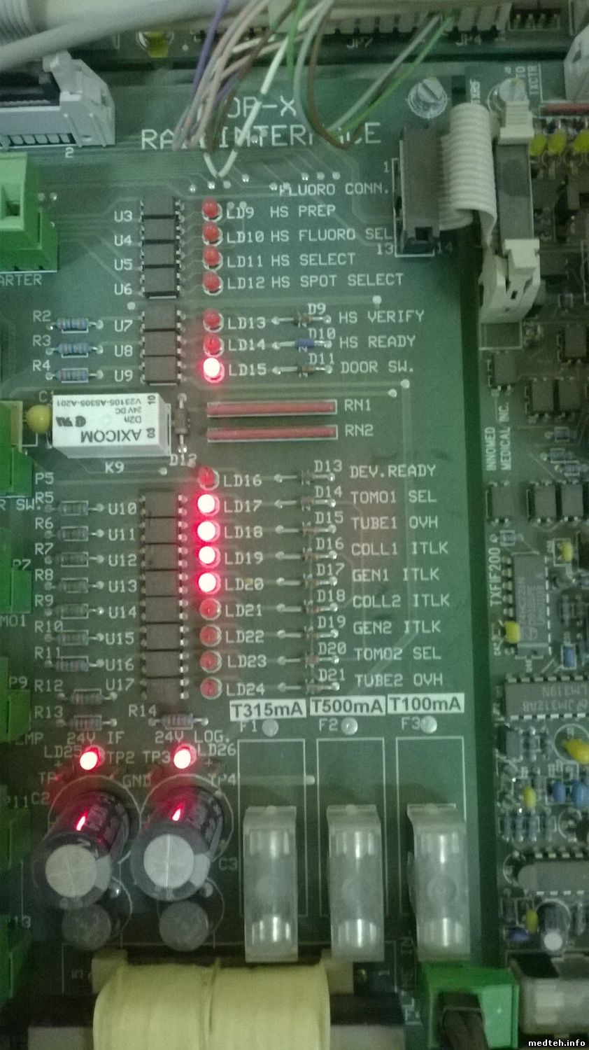 Трехфазное питание соответствует нормам и присутствует. Накал светится, при подготовки к снимку яркость "форсируется". На платах TXFIL5 для малого и на плате для большого фокуса светятся светодиоды +15В, -15В и светодиоды О.К. При замере на "плате большого фокуса" между контрольными точками TP1-TP3 и TP2-TP3 значения напряжений (соответствующие 1В напряжение это 1А тока) совпадает, что говорит о том, что заданное значение тока совпадает с измеренным, хотя и при изменении тока на пульте и проведения экспозиции значение напряжения (соответствующего 1В-1А) не меняется и остается 2,77В. Высоковольтный бак пока не вскрывали.