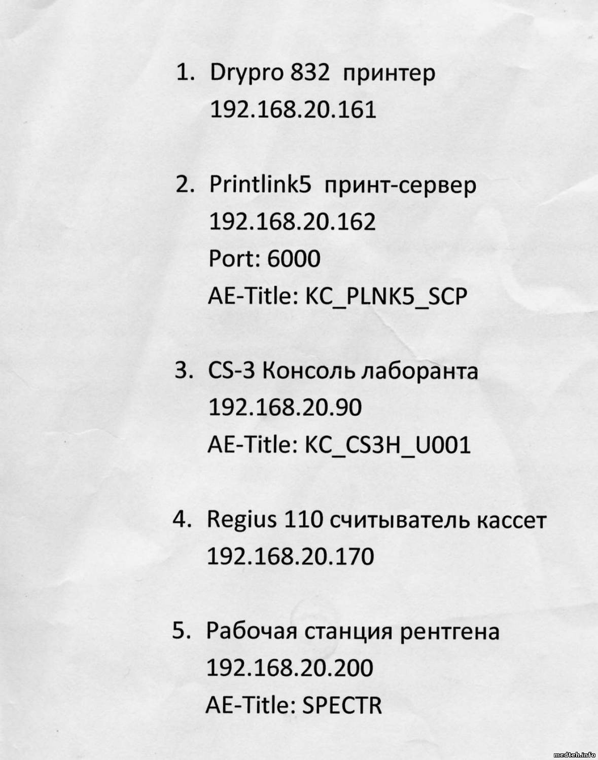 :) Я крайне извиняюсь за свою техническую неграмотность и незнание терминов. Немножко проясню ситуацию: почему именно я об этом пишу. Я программист при больнице, веду учетную систему, имею опыт администрирований сетей по windows, немного имею представление о линуксе, т.е. всего понемножку. Наш заведующий диагностикой обратился ко мне, так как отчаялся добиться результатов от приглашаемых спецов из разных городов Украины, хотя я ему обяъснил, что я в данном случае "просто сообразительный парень" и не занимаюсь тем, чем он хочет. Но мне пока интересна эта проблема. Я прочитал те куски документации, что сохранились, попытался пообщаться с теми товарищами, что ездили к нам (не очень щедро делятся знаниями), врачами, нашими сисадминами - всеми, кто хоть что-то может знать. Даже обращался в Thales о получении документации по их камере из Баккары (с дальней наметкой о попытке вообще отказаться от встроенного ПО) - ничего не ответили. Поиск по инету дал вот этот форум,единственное место, где эту Баккару обсуждают, а не продают. 1. На столе рядом с компьютером 2 пульта: на одном управление столом (крутить, вертеть и т.д.) - на нем я нажимаю кнопки скопии и графии. На втором пульте - кнопки переключения режимов сьемки - с кассетой и без, легкие, брюшина и т.д., вот на этом пульте при съемке фото в правом нижнем углу моргает желтый огонек (врач говорит, что это "высокое напряжение"). На экране возникает просто однотонный круг - как бы пустое фото, при этом фотография в программе у снимаемого пациента не добавляется. - там вообще-то есть "рецепторы" (рабочие места), на всех них ничего не сохраняет? Рабочее место одно (правильно - рецептор?) - ничего не сохраняет, видео видим, фото не видим. - Может дело в настройках программы? (fluoro и Rad разные..) что имеется ввиду? - Слетала батарейка в РПУ? Тоже не понял - в компьютере все ок с батарейкой, но я так понимаю речь не о нем. В пульте, на столе который (не знаю в каком из двух, могу уточнить) - меняли год-два назад, мне говорили что была такая проблема. - Работает связь Лаб-Врач? И это не понял. 2. Адреса проверю. Фактически к баккаре подключен только один компьютер, о котором и речь, к нему через сетевую карту подключен принтер, на который хочется печатать. Уточнял, сказали печатал еще год назад, но ломалось то одно, то другое, теперь вот так. Оригинального образа у нас нет, есть только то, что есть. Чувак вроде привозил, то, что он назвал оригинальным образом, но завести он аппарат на нем не смог и вернул все как было, опять же все с его слов, за ним не следили, что он там делал, и образа того он нам не оставил. 3. По поводу бирок посмотрю, уточню. Генератор точно Магнум - такое слово звучало.
