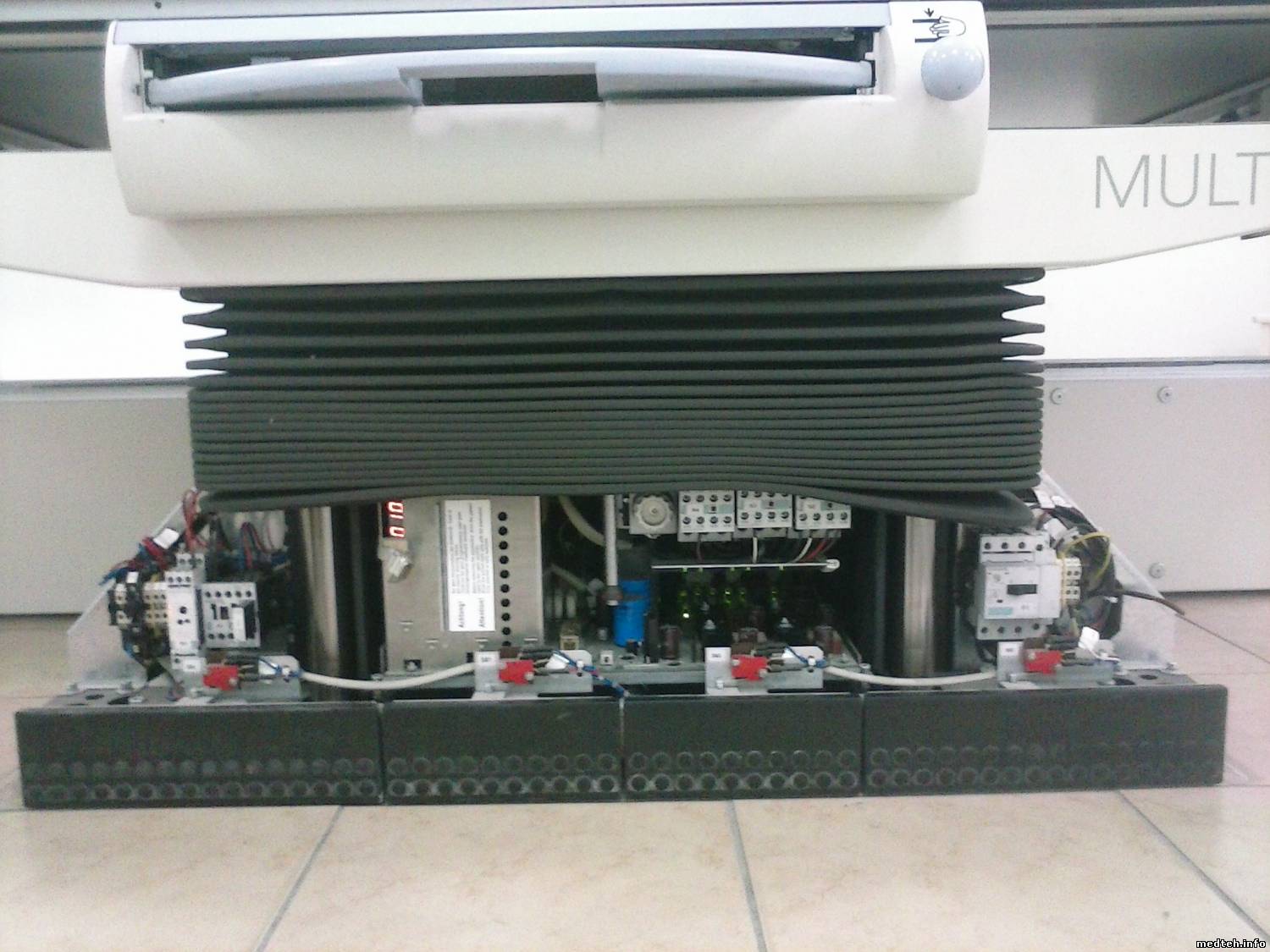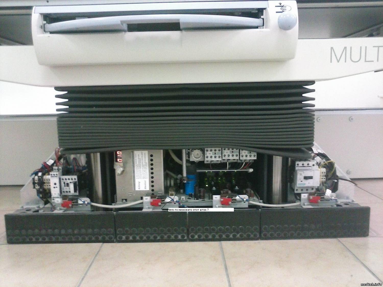 Начну сначала и по порядку. При отключенном аппарате санитарка, протирая аппарат случайно нажала "грибок", кнопку экстренного отключения на столе и не заметила. Рентгенолог придя с утра, включает рентген, он соответственно работать не желает. Врач выяснил в чем дело, кнопку отжали, но при этом расстояние трубка-кассета перестала мерятся, стол не реагирует на поднятие и опускание, отсутствует возможность сделать снимок на столе т.к. кассета не определяется. В настоящее время, снимки делают вертикально на штативе VERTIX. Каких либо ошибок при этом на дисплее пульта управления не отображается. На трубке, лишь меняются цифры 005, 010, ни одна из кнопок не реагирует. Прикрепляю фотографии увиденного. Это первое моё знакомство с Siemens Multix Pro. Подскажите пожалуйста, с чего нужно начать? Куда лезть, где копать? Буду очень признателен за любую помощь. Питающее Polydoros IT