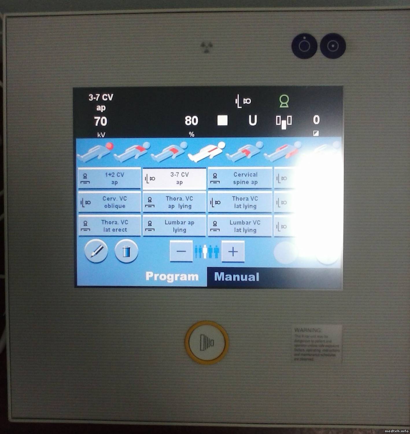 номера ошибок надо смотреть под юбкой (как на фото 2 горит 010) 005 Boot: Notstopp (nicht bei PRO Fix) Fehler in Notstoppkreis, Primär-, Sekundär- oder Hilfskreis des Schützes K2, oder K2 selbst Boot: Emergency stop (not in FMT with out table hight movement) Error in safety circuit, premary circuit of K2, secundary circuit of K2, help circuit of K2, or relais K2 of it self 006 Kabelbruch am Notstoppsensor, Fehler in Hilfskreis von K2 Cable break on emergency stop sensor, Error in help circuit of K2 007 XCS-Controller: Host defekt, in Multix nicht benutzt XCS controller: Host defective, not used in Multix units 008 Oszilator Watchdog Reset. Dynamischer Programmfehler: Bitte Nachricht an Entwicklung Oscillator watchdog reset. Dynamic software prcedure error: Please inform the development department 009 Watchdog Reset. Dynamischer Programmfehler: Bitte Nachricht an Entwicklung Watchdog reset. Dynamic software prcedure error: Please inform the development department 010 Notstopp ausgeloest. Sicherheitskreis angesprochen, Unterbrechung im Schützkreis K1, überprüfe Schalter S41,42 (TOMO Stativ) evtl.Notstopp lösen Limit switch active,no connection in the safety circuit K1, check S41,42 on TOMO CTM, release emergency switch, if possible. 011 Notstopp ausgeloest. Notstopp lösen Emergency stop triggered. Release emergency switch