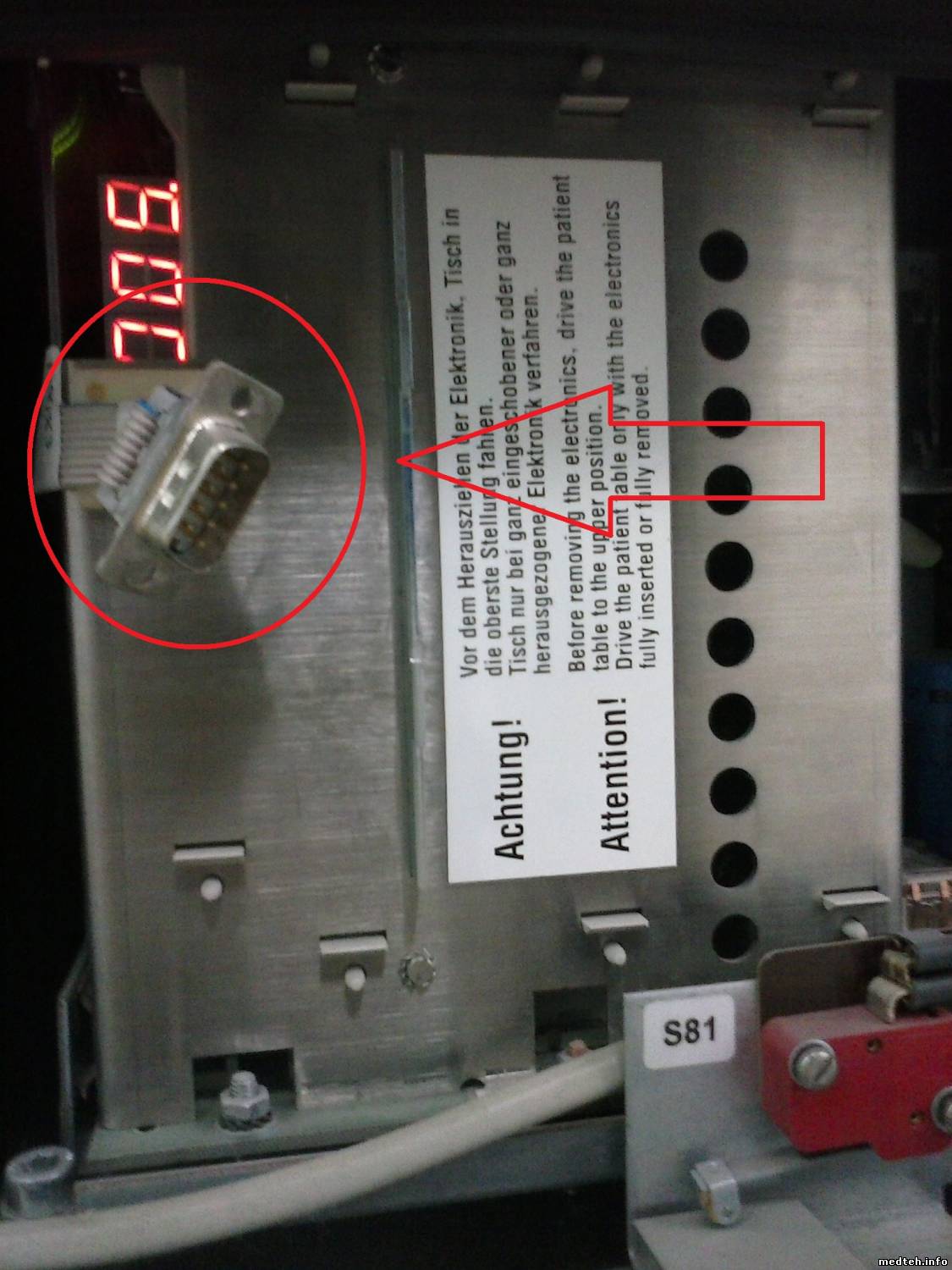 Через этот разъем происходит сервисное подключение ноутом к системе , при наличии программы и инструкции . А на индикаторе считываем последовательно ошибки При подключении ноутом можно настроить положение аппарата. Может санитарка попутно зацепила тросик или резюк положения? А так посоветовал бы проверить напряжения в столе ... возможно пропало напряжение , подгорела обмотка трансформатора. Стол практически автономен , соответственно лифт работать должен