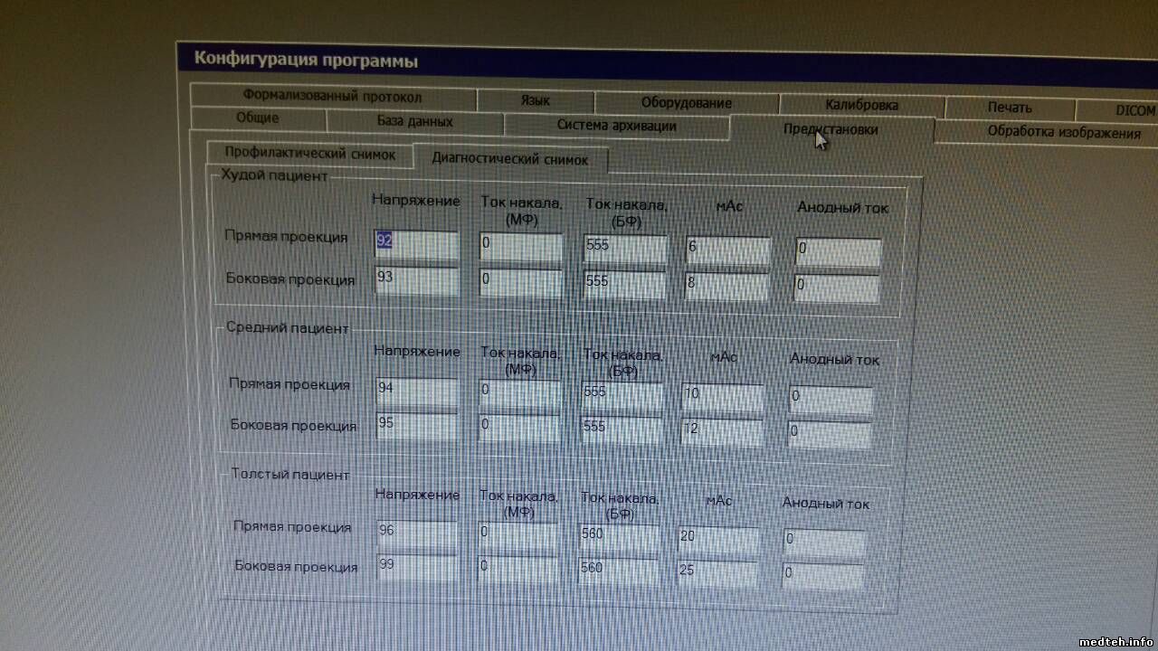 В аппарате в конфигурации программы есть предустановки на разные типы пациентов . Напряжение и величина мАс выставляются согласно этим предустановкам. То есть на тослтого пациента в боковой проекции должно быть 99 кВ и 25 мАс. Для нашего примера был средний снимок прямая проекция, т.е. 94кВ 10 мАс.