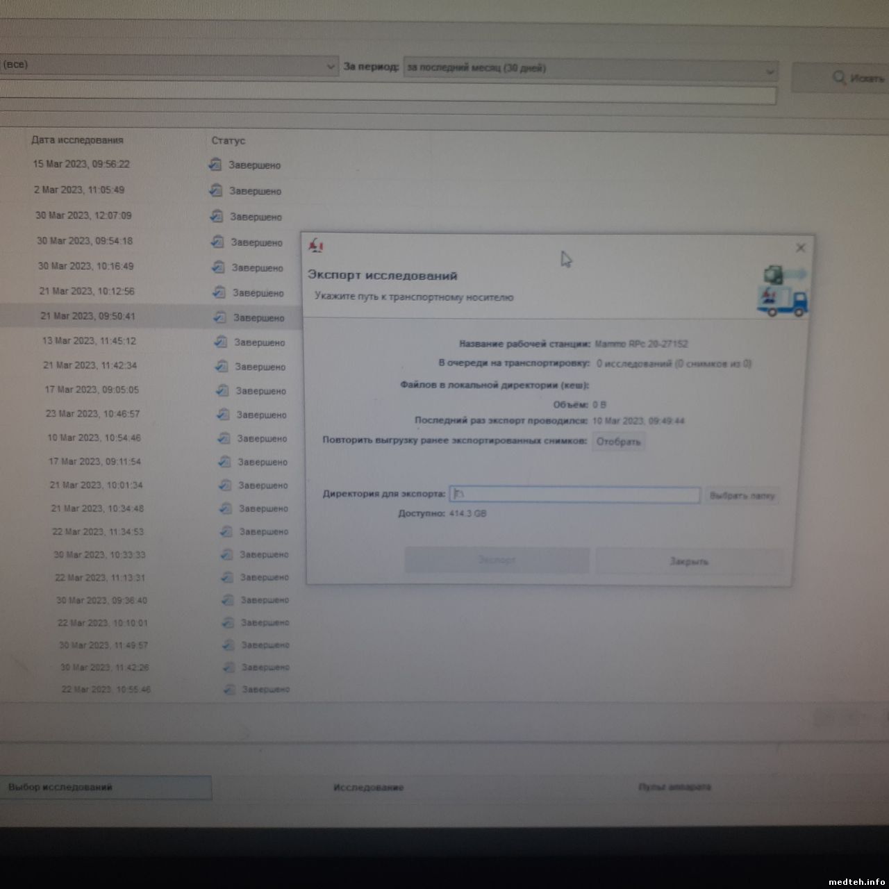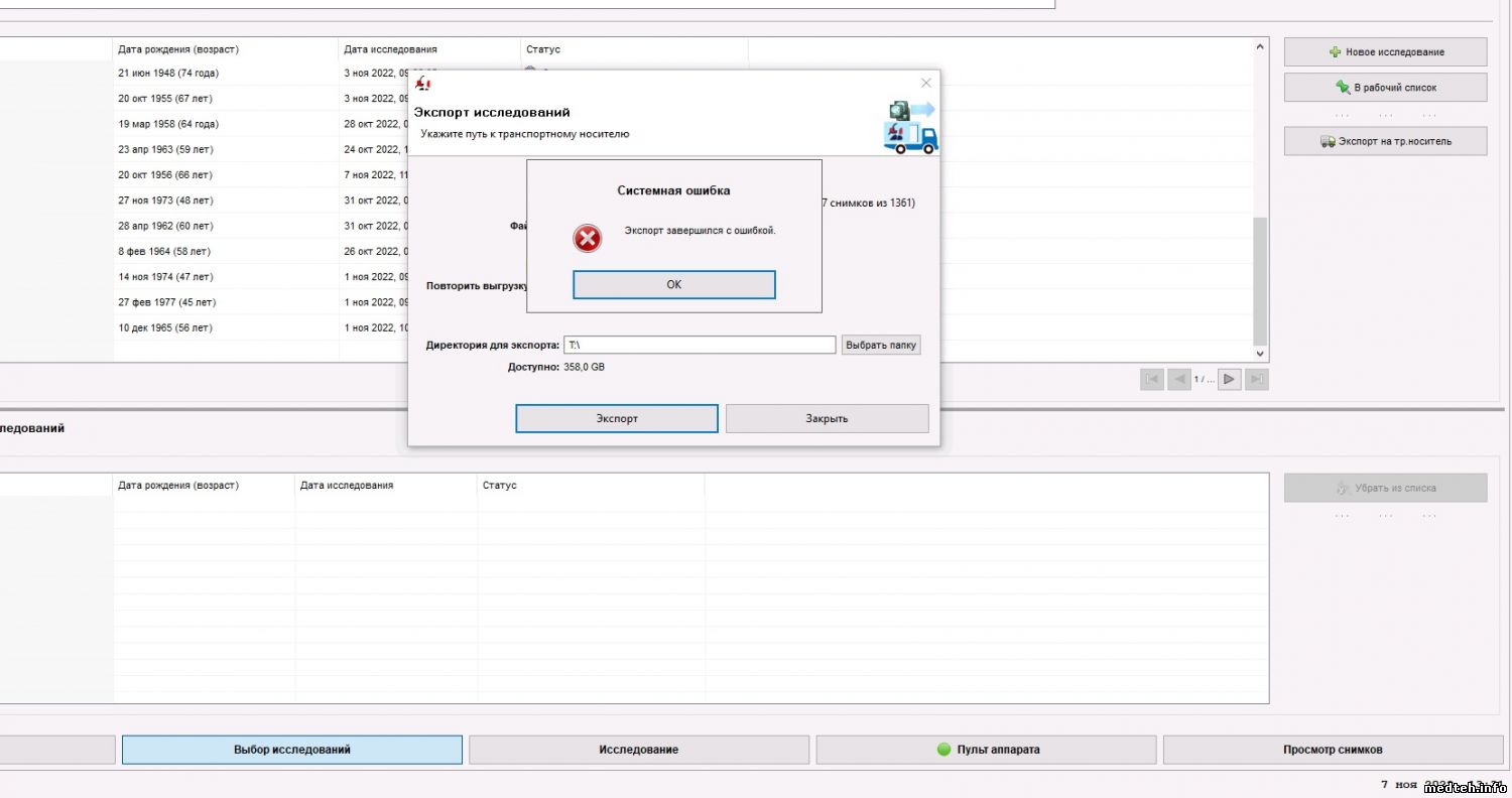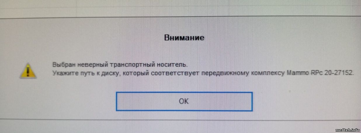 Проработав недолго, при экспорте снимков перестал скидывать их на транспортный носитель (переносной HDD, который шёл в комплекте) с такой вот ошибкой: «Выбран не верный транспортный носитель. Укажите путь к диску, который соответствует передвижному комплексу Mammo RPc 20-27152».