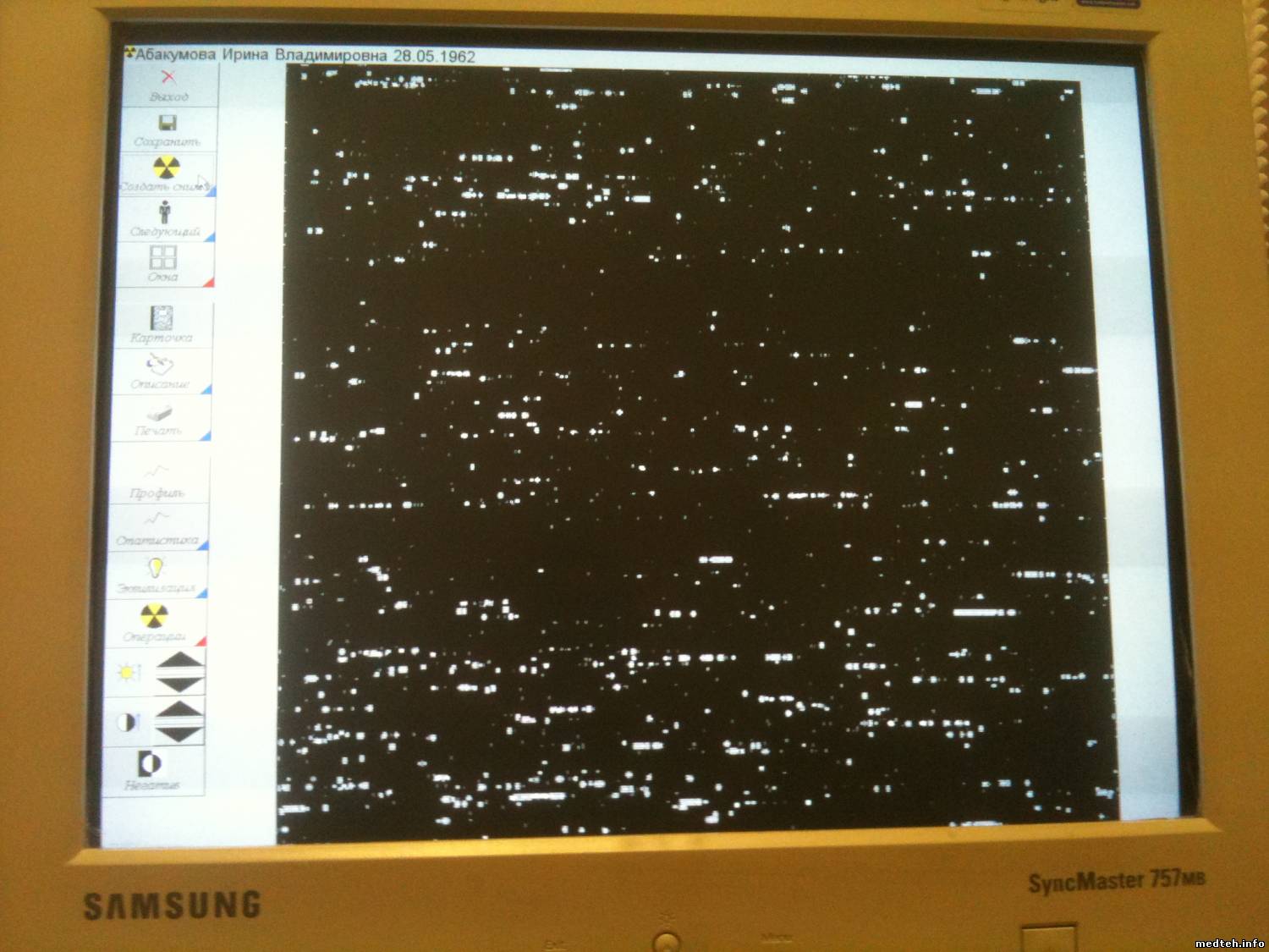 Теперь же картина такая же, но с одним но первые два снимка идет черный фон на котором многочисленные белые точки, а потом черный квадрат. И так повторят после включения выключения флюорографа.