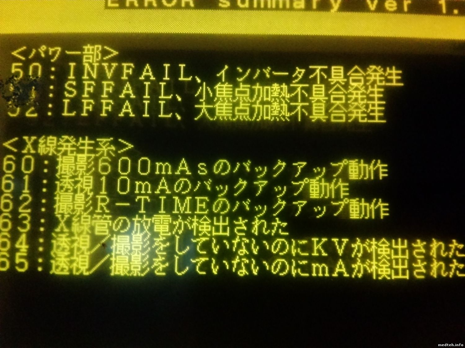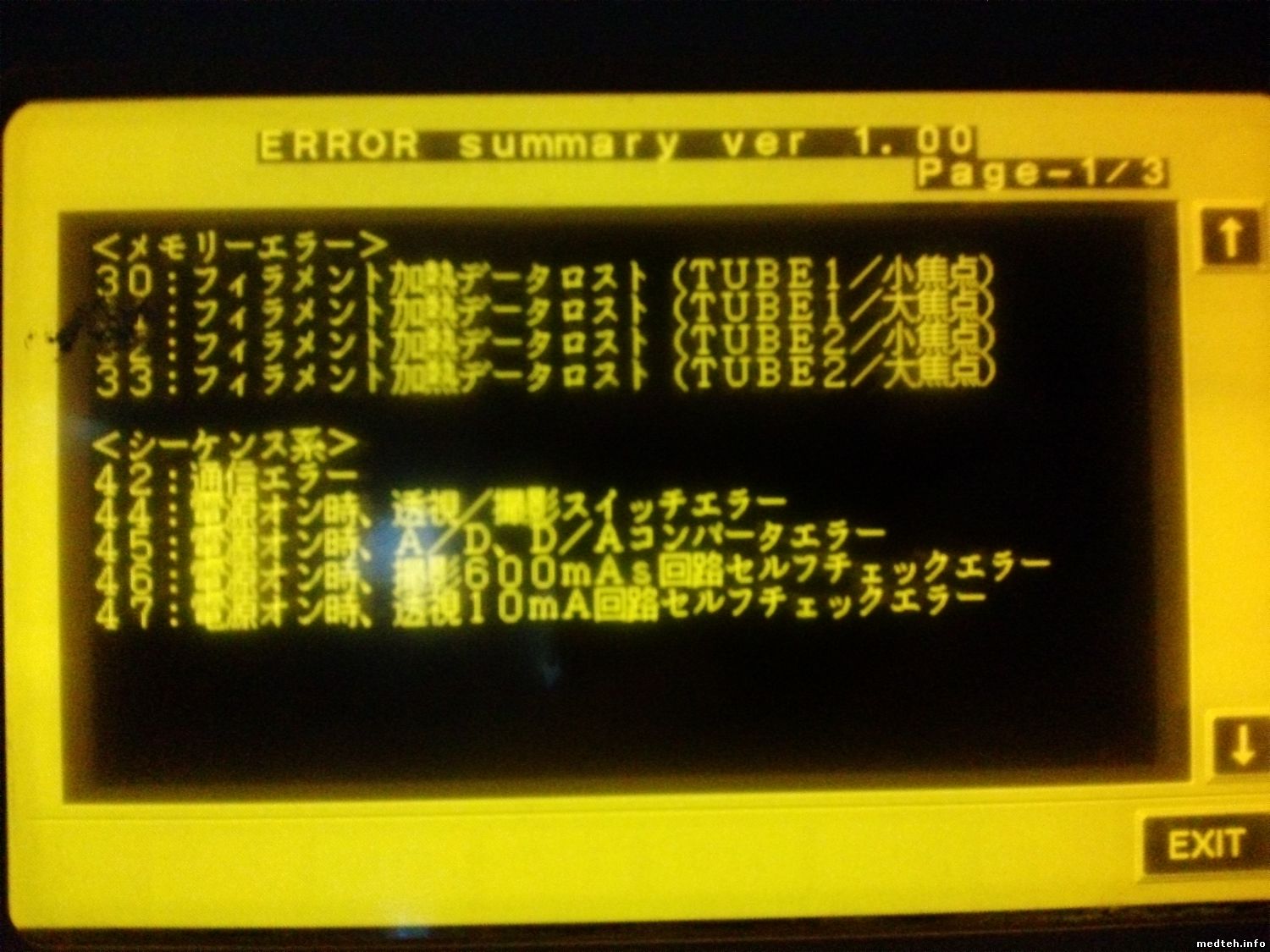Filament heating data lost (Tube2/small focus) Ошибка памяти. Что-то произошло с настройками накала малого фокуса (сдохла батарейка, качнуло сеть .....). Если не ошибаюсь. Давно с тошибой не работал.