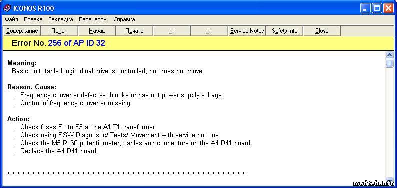 По-русски: Ошибка 256/32. Значение: Базовый блок: столешница в продольном направлении управляется, но не двигается. Причина: - Дефект преобразователя частоты, заблокировано или отсутствует напряжение питания. - Отсутствует управление частотным преобразователем. Действия: - Проверьте предохранители F1-F3 на A1.T1 трансформатора. - Проверьте с помощью SSW Диагностика/ Проверка/ Движения управление с кнопки. - Проверьте M5.R160 потенциометр, кабели и разъемы на плате A4.D41. - Заменить плату A4.D41.